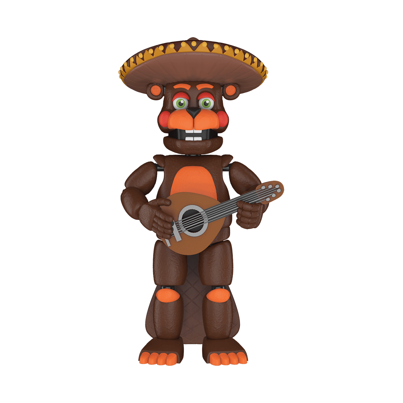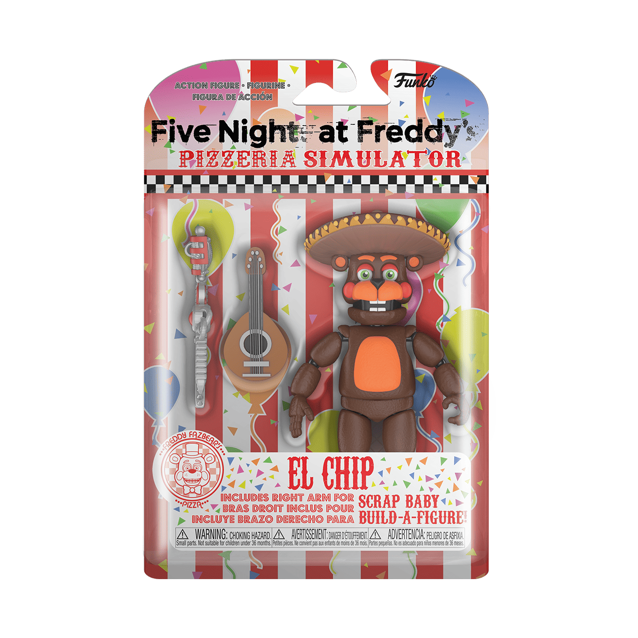 Close in on your favorite Five Nights at Freddy’s Characters before they move! Catch Action-Figure El Chip from Freddy Fazbear’s Pizzeria Simulator in action. Action-Figure El Chip carries a guitar and includes a build-a-figure piece for constructing your own Scrap Baby. Collectible action figure has multiple points of articulation and is approximately 5 in (12.7 cm) tall.