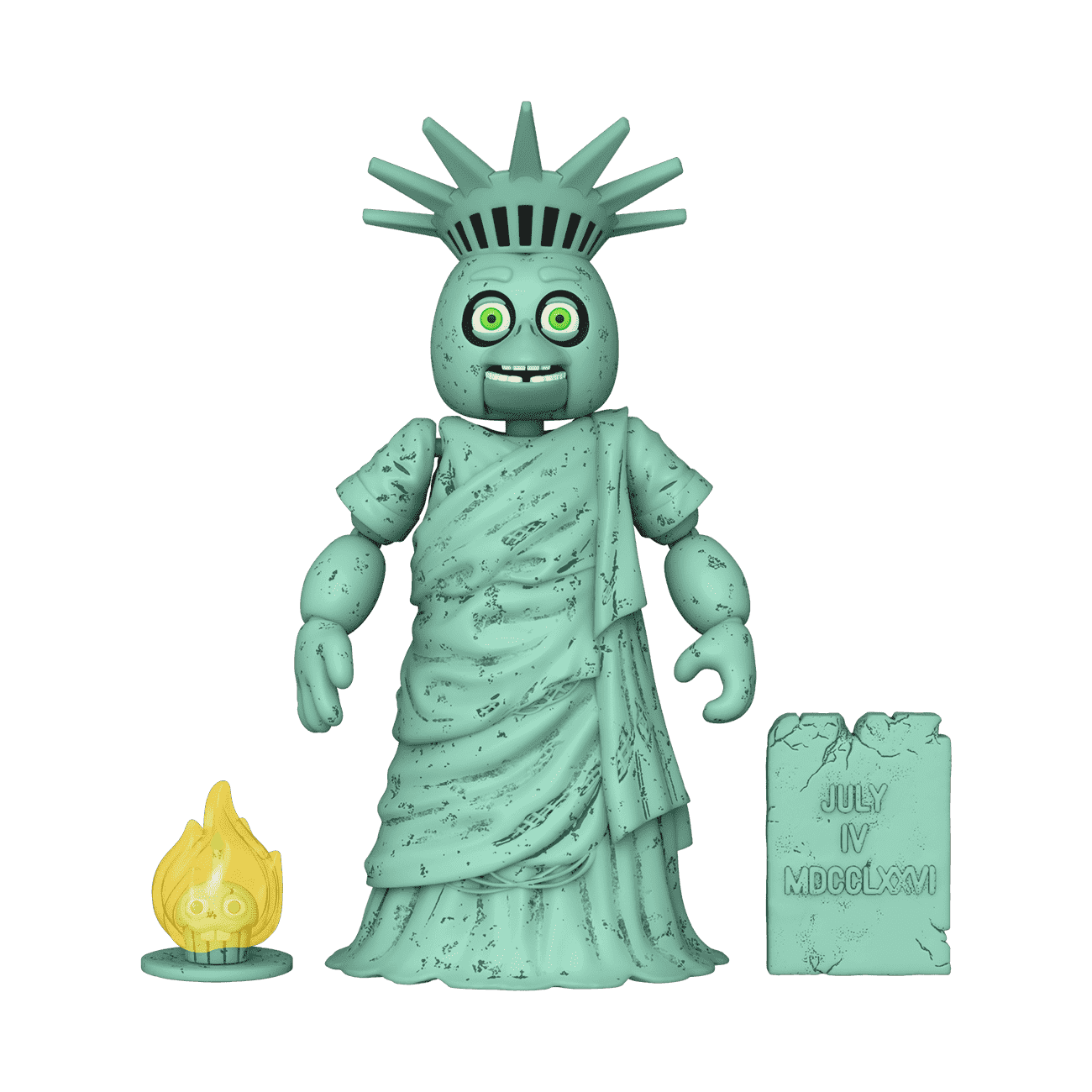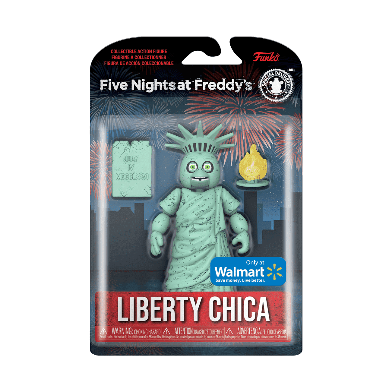 Free to move about, Chica from Five Nights at Freddy’s wants to jump into your collection as Walmart-exclusive Liberty Chica Action Figure. Action Figure Liberty Chica is dressed as the Statue of Liberty. She comes with a flaming cupcake instead of a torch and a tablet with the date of the Declaration of Independence in Roman numerals. Take her home to add her to your Five Nights at Freddy’s set. Collectible action figure has multiple points of articulation and is approximately 5 in (12.7 cm) tall.