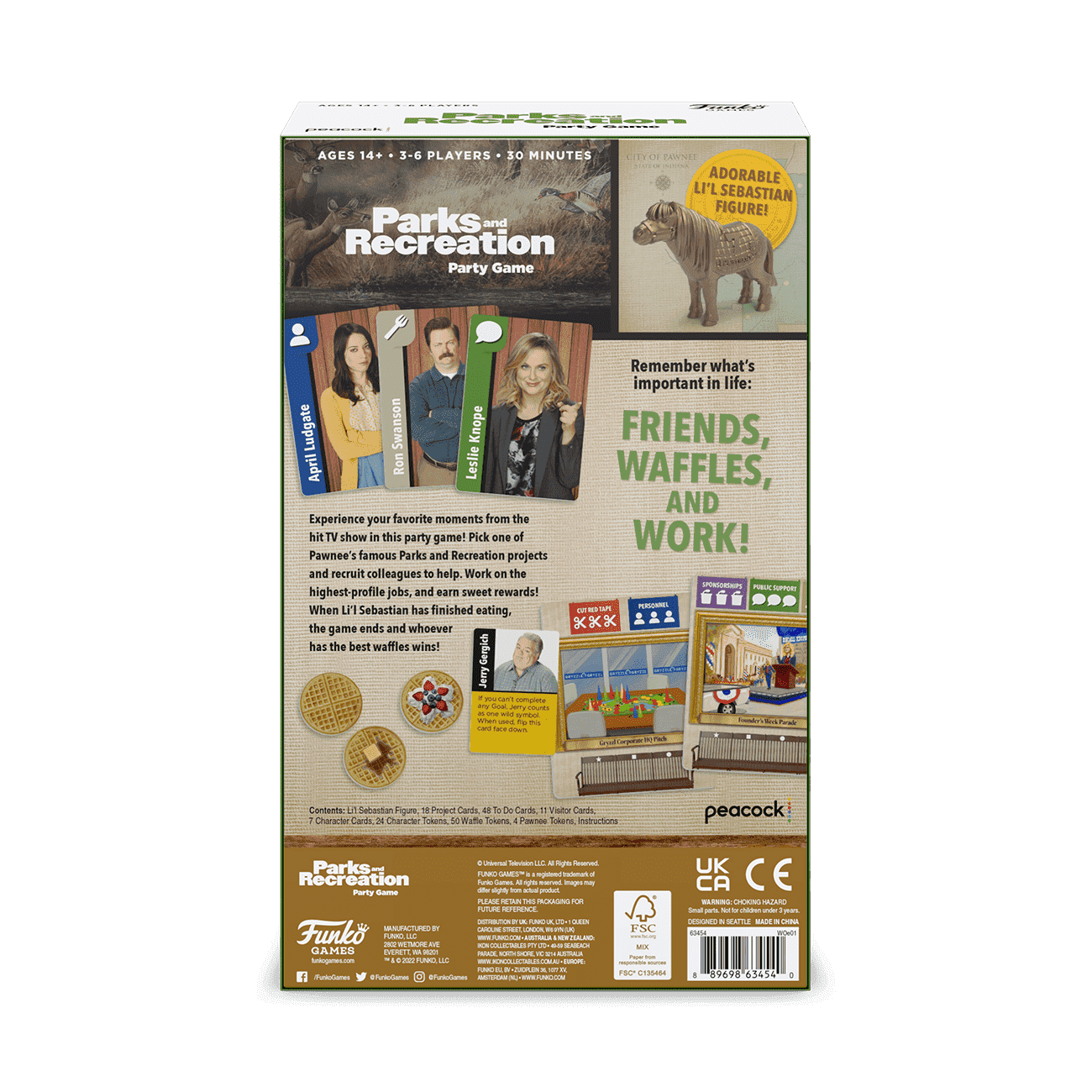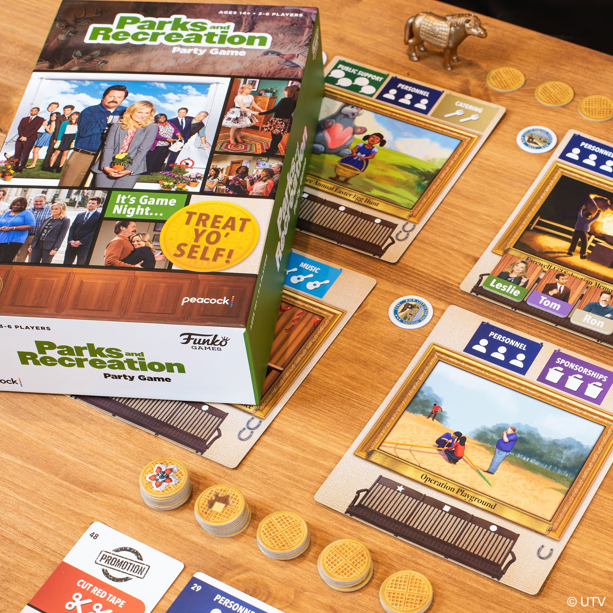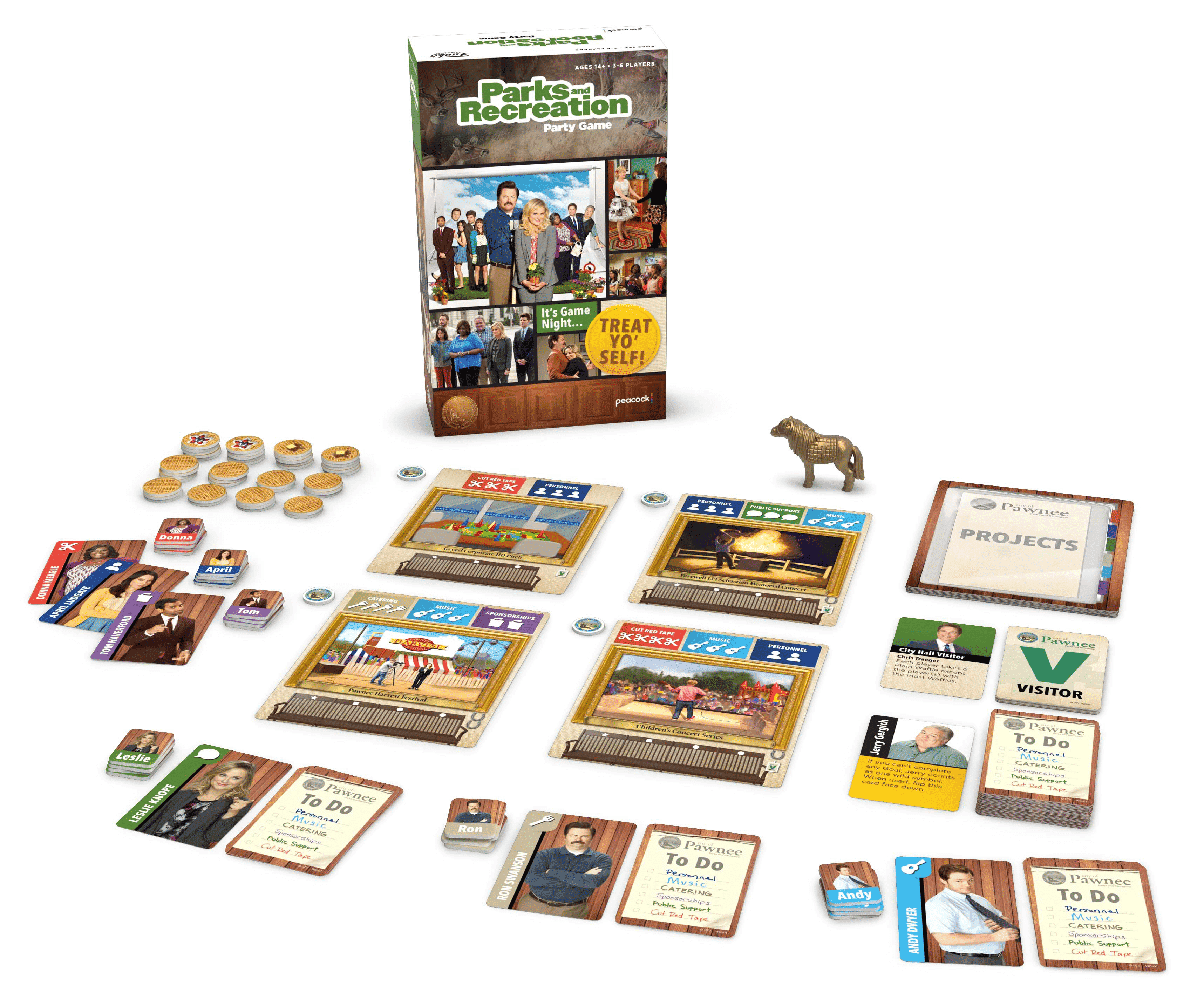 Pick one of Pawnee’s famous Parks and Recreation projects, make deals, and recruit help. You’ll need to work with your colleagues, but if you can take more credit, you’ll earn sweeter rewards. When Li’l Sebastian is done eating, the game ends and whoever has the best waffles wins!