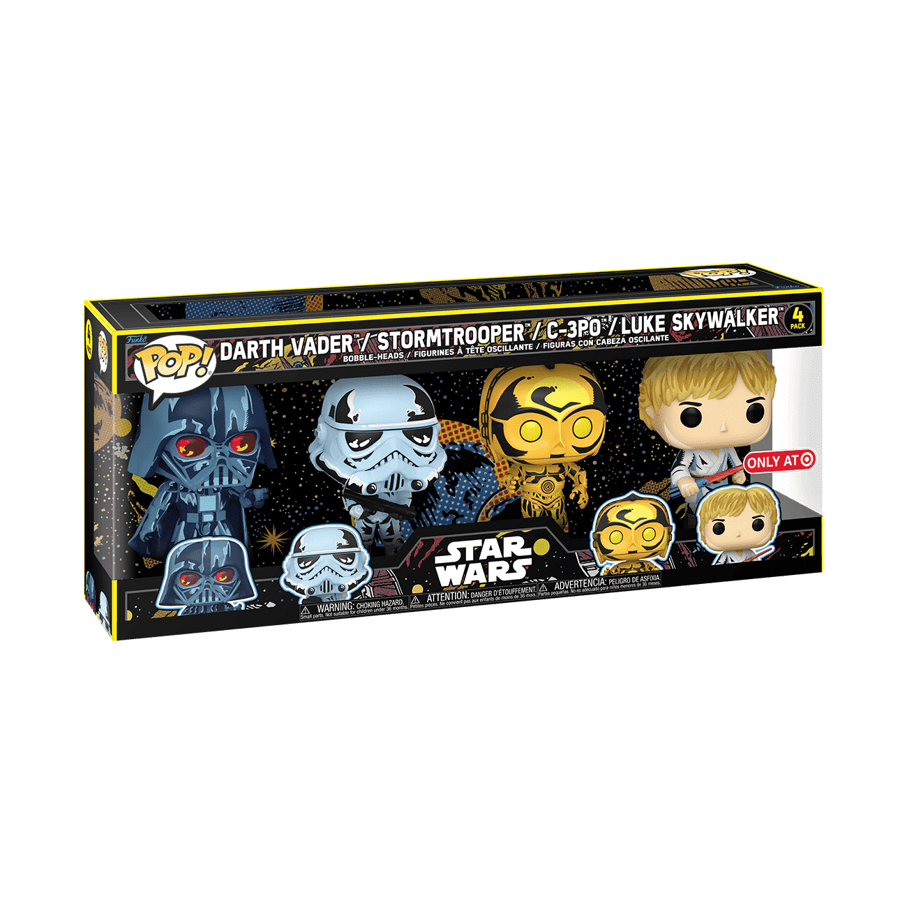 This special series of STAR WARS™ Pops! is based on retro comic book art of the spectacular space saga. Bring home a piece of the stellar series with the exclusive, 4-pack set including: Pop! Darth Vader, Pop! Stormtrooper, Pop! C3PO, and Pop! Luke Skywalker. Vinyl bobbleheads range in height from approximately 4.5 in (10.2 cm) to 5 in (12.7 cm) tall.
