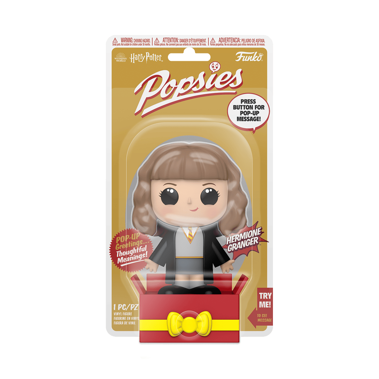 Surprise a friend or loved one with open arms and a pop up greeting with Popsies, the new collectible greeting by Funko! Press the center of the bow and the special message appears above Hermione Granger as she holds her arms out wide. You can even write who it's from and for with a permanent marker on the present's label. Share a sentiment and a smile with an awesome Popsies Hermione Granger! Vinyl collectible greeting is approximately 4.75 in (12.1 cm) tall. Warning: Not for children under the age of 3 years old.