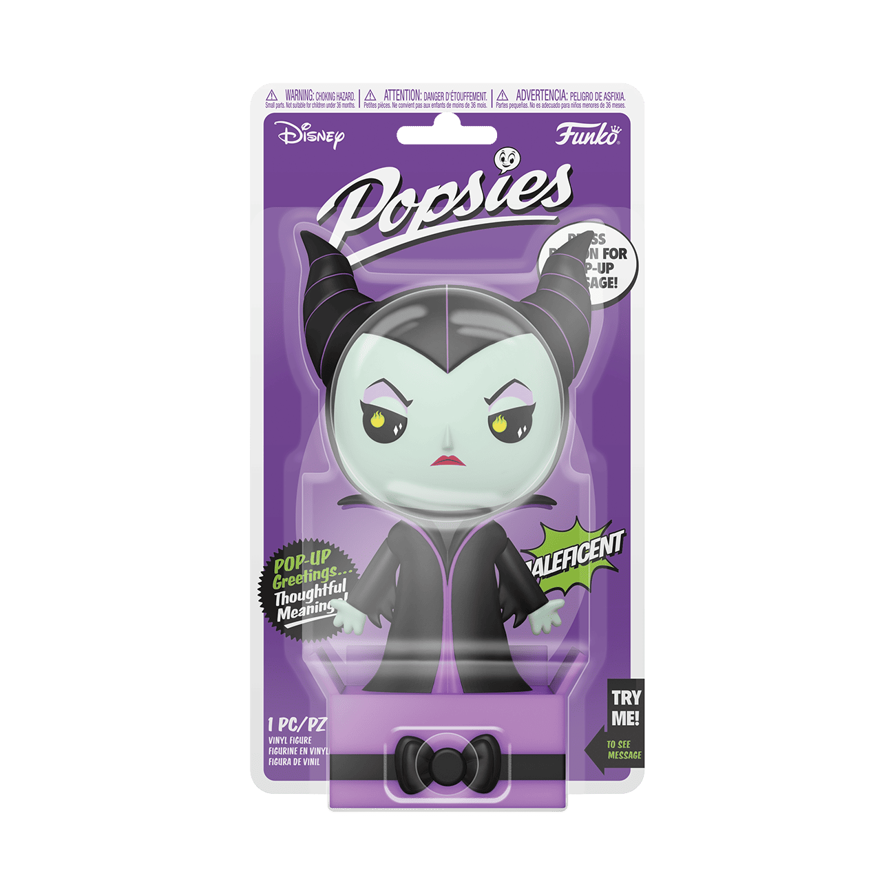 Surprise a friend or loved one with open arms and a pop up greeting with Popsies, the new collectible greeting by Funko! Press the center of the bow and the special message appears above Disney Maleficent as she holds her arms out wide. You can even write who it's from and for with a permanent marker on the present's label. Share a sentiment and a smile with an awesome Popsies Disney Maleficent! Vinyl collectible greeting is approximately 5.25 in (13.3 cm) tall. Warning: Not for children under the age of 3 years old.
