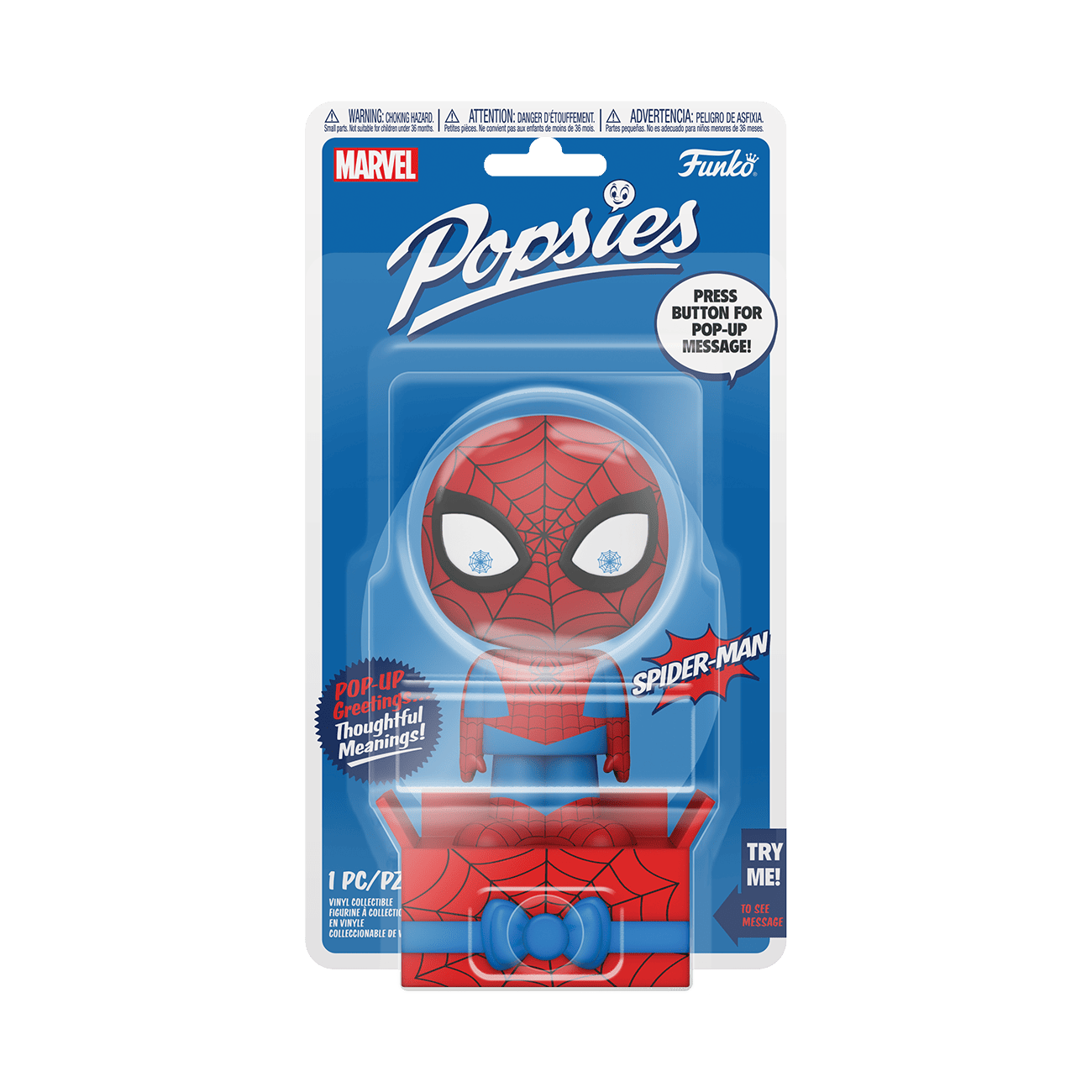 Surprise a friend or loved one with a pop up greeting with Popsies, the new collectible greeting by Funko! Press the center of the bow and two special messages appear! You can even write who it's from and for with a permanent marker on the present's label. Share a sentiment and a smile with an awesome Popsies Spider-Man! Vinyl collectible greeting is approximately 4.75 in (12.1 cm) tall. Warning: Not for children under the age of 3 years old.