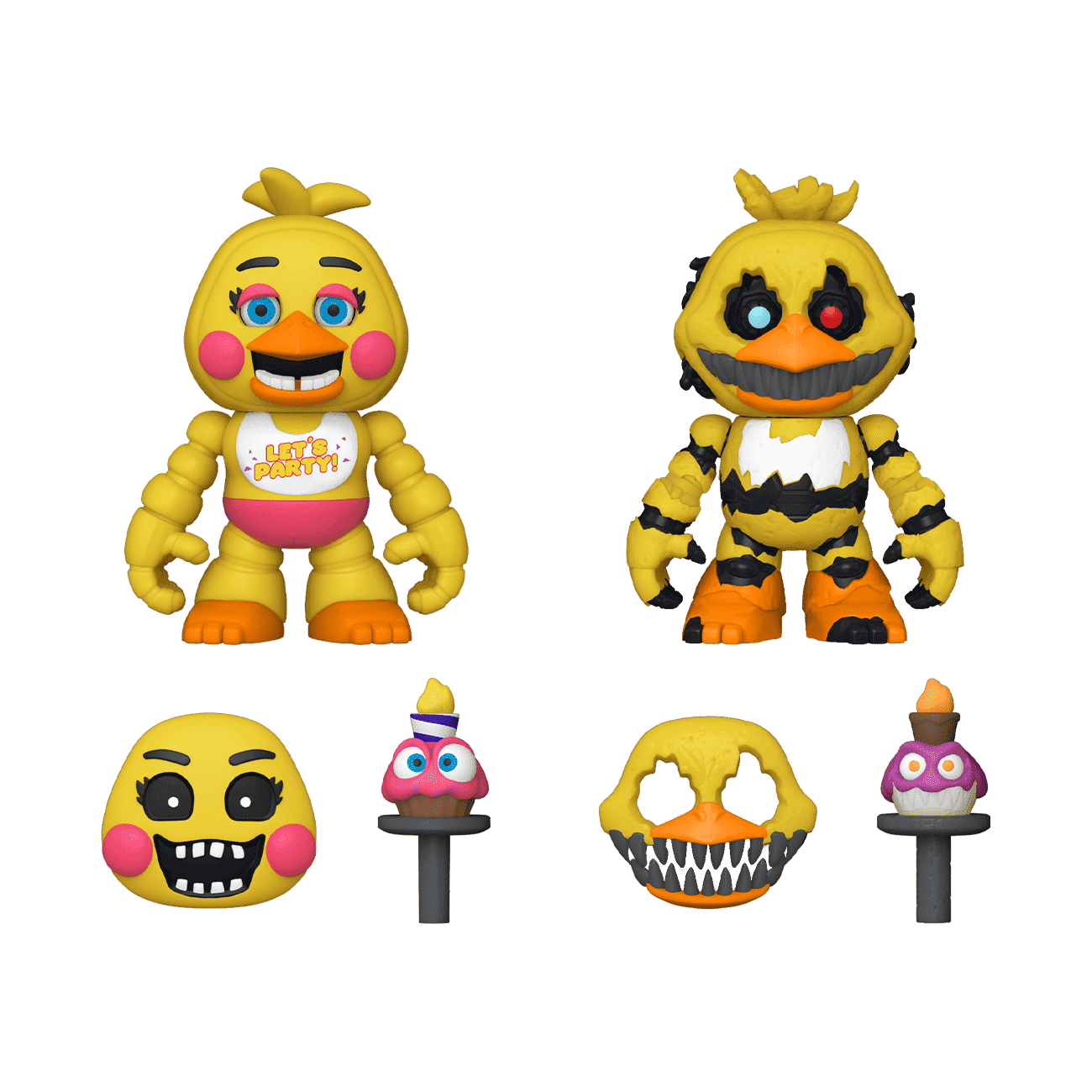 Survive the night at Freddy Fazbear’s in a snap! Close in on this 2-Pack of Toy Chica and Nightmare Chica as Funko SNAPS! collectibles. SNAPS! Toy Chica and SNAPS! Nightmare Chica have six different pieces each that snap into place, including a head, two interchangeable faces, a torso, legs, and an accessory.