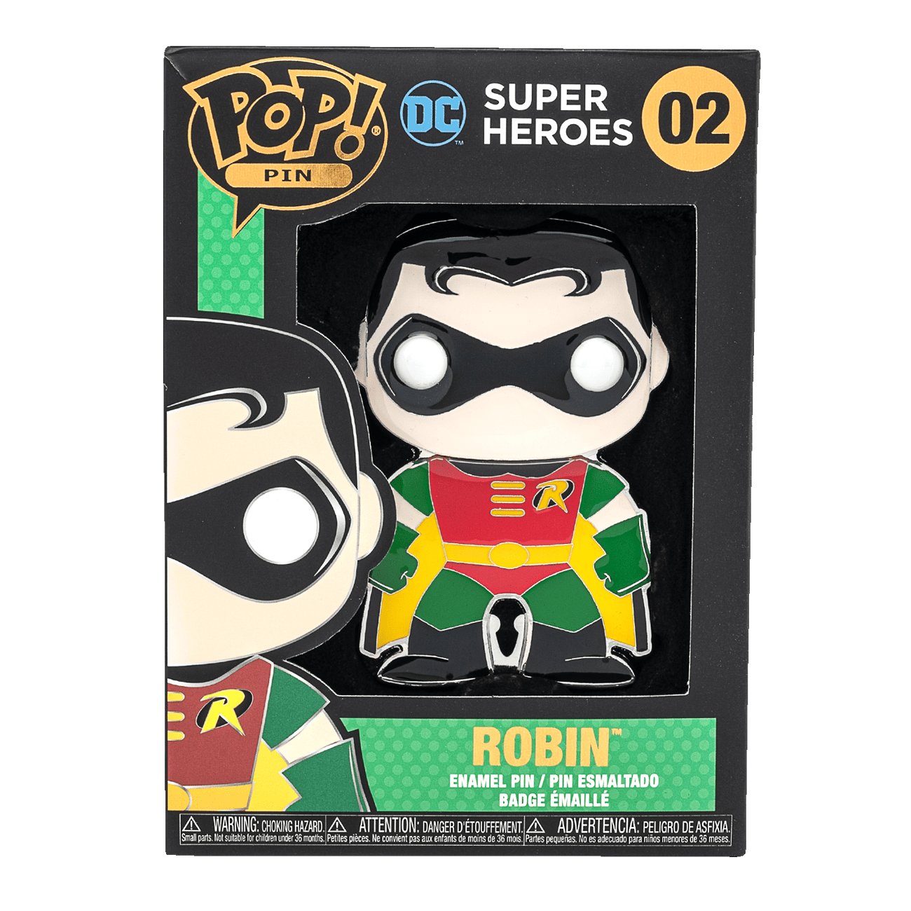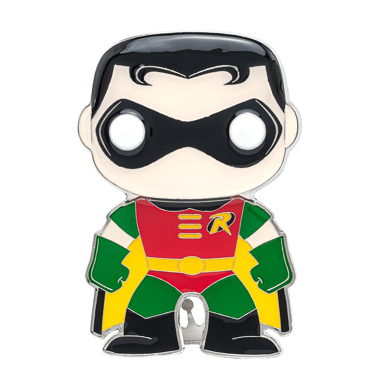Batman needs his trusty sidekick Robin to help him fight Gotham villains in your DC collection. This Pop! Pin Robin features the sidekick in his classic suit and is ready to join Batman for their next adventure. Pin features a soft enamel fill on silver colored hardware and a built-in stand. Enamel pin is approximately 3.75 in (9.5 cm) tall.