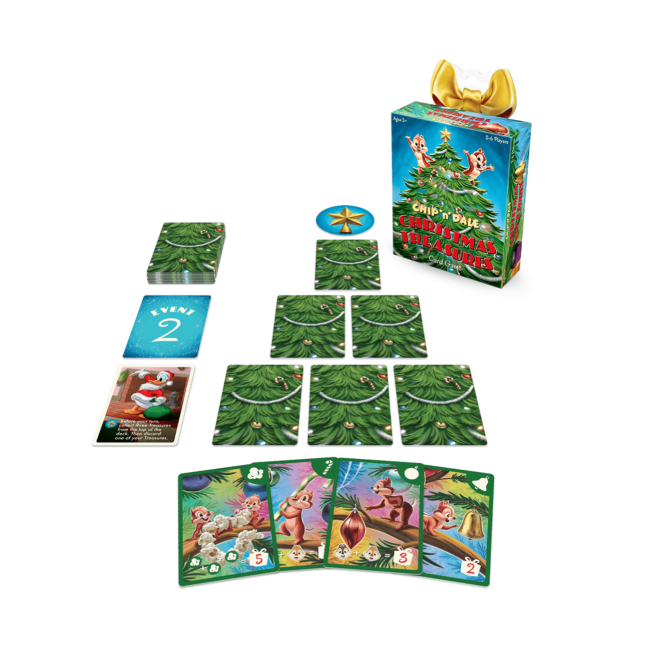 Chip ‘n’ Dale have found their way into the Christmas tree! Help them collect treasures and treats for their winter stockpile and avoid getting caught by Pluto! On your turn, flip over cards to discover the hidden treasures and treats in the tree. Collect two cards and add them to your collection, but if Pluto caught you, you only take one! Grow your collection each turn and have the collection with the most points by end of the game to win!