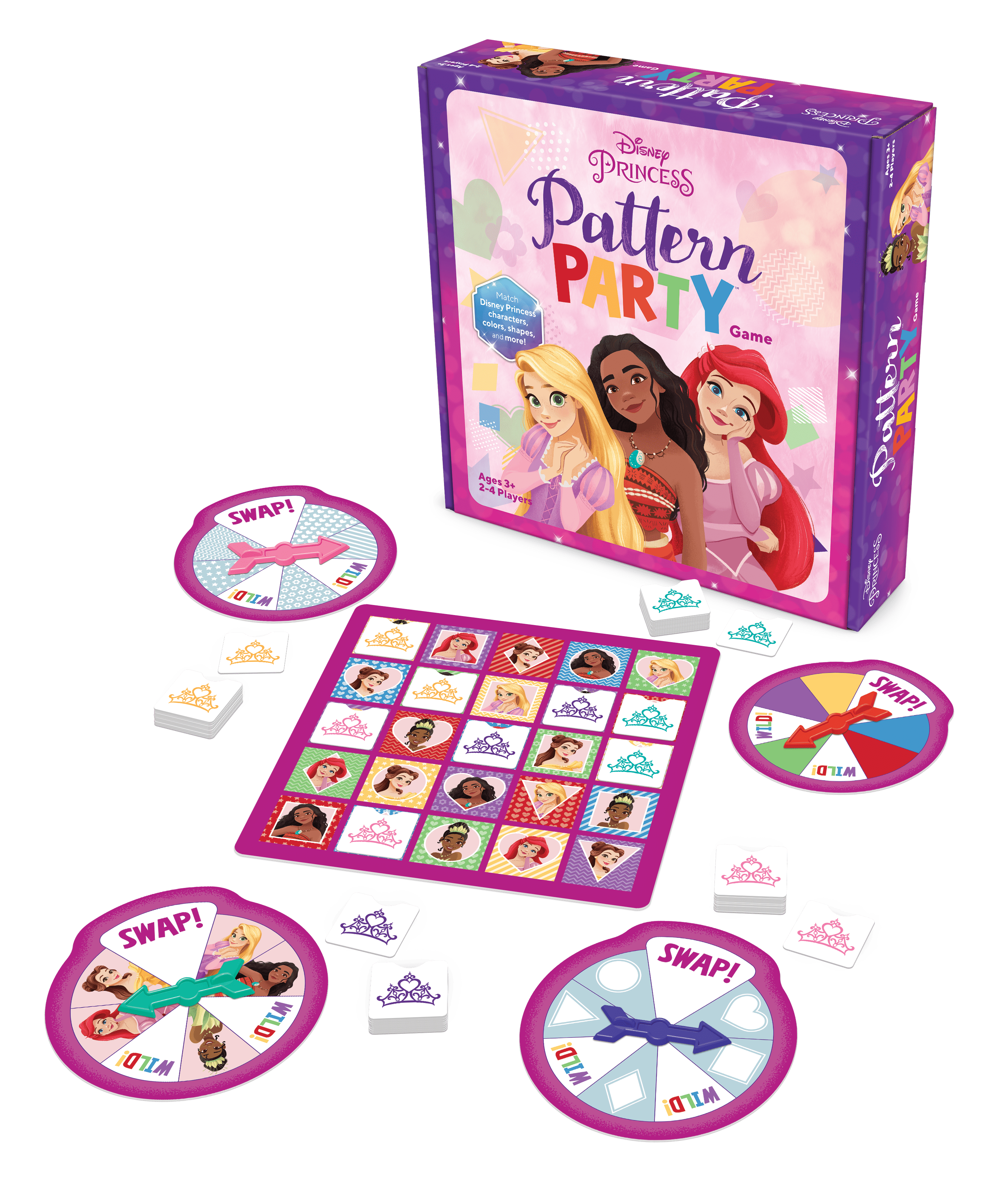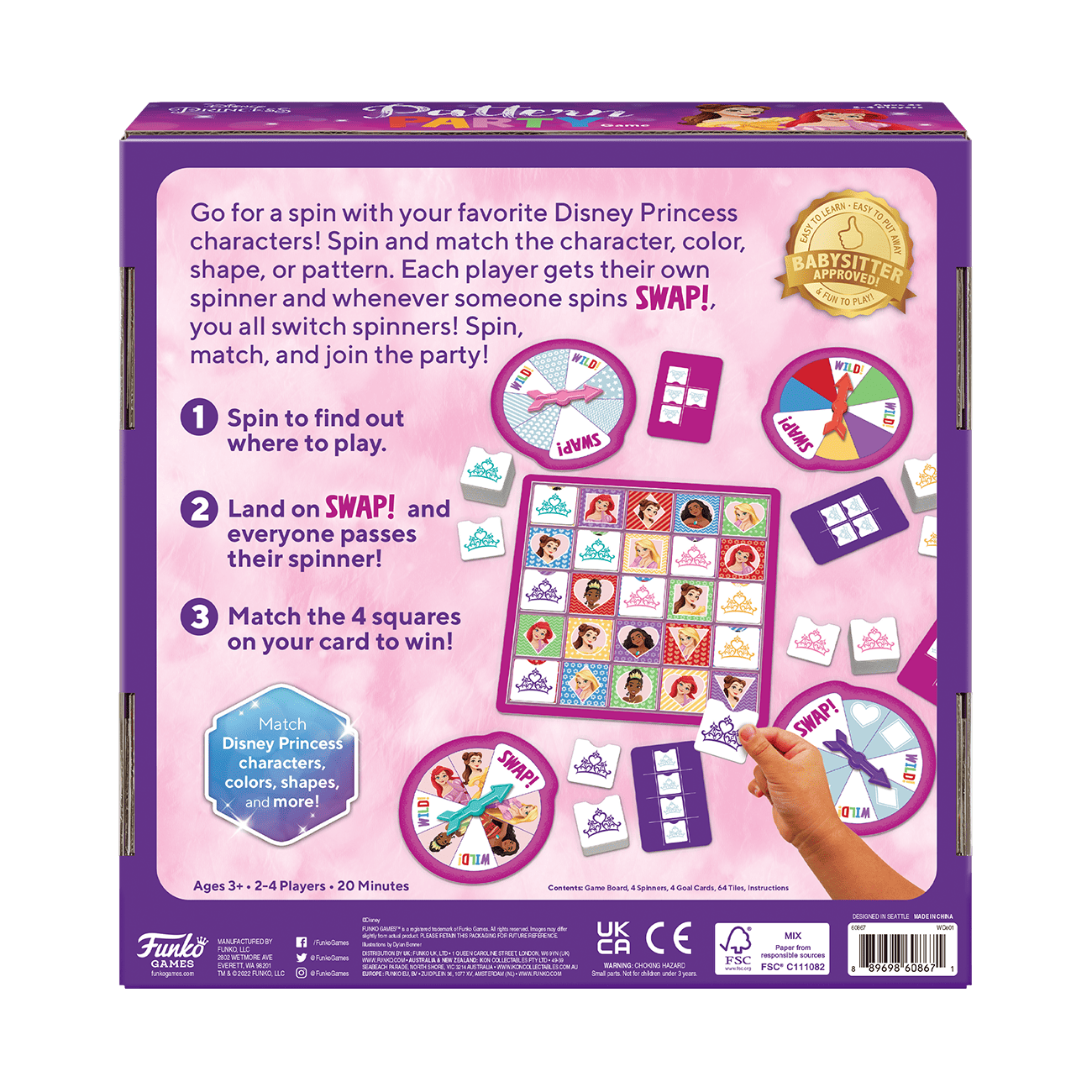 Go for a spin with five of your favorite Disney Princess characters! Spin and Match the character, color, shape, or pattern. Each player gets their own spinner and whenever someone spins SWAP! you all switch spinners. Spin, match, and join the party! Match the four squares on your goal card to win!