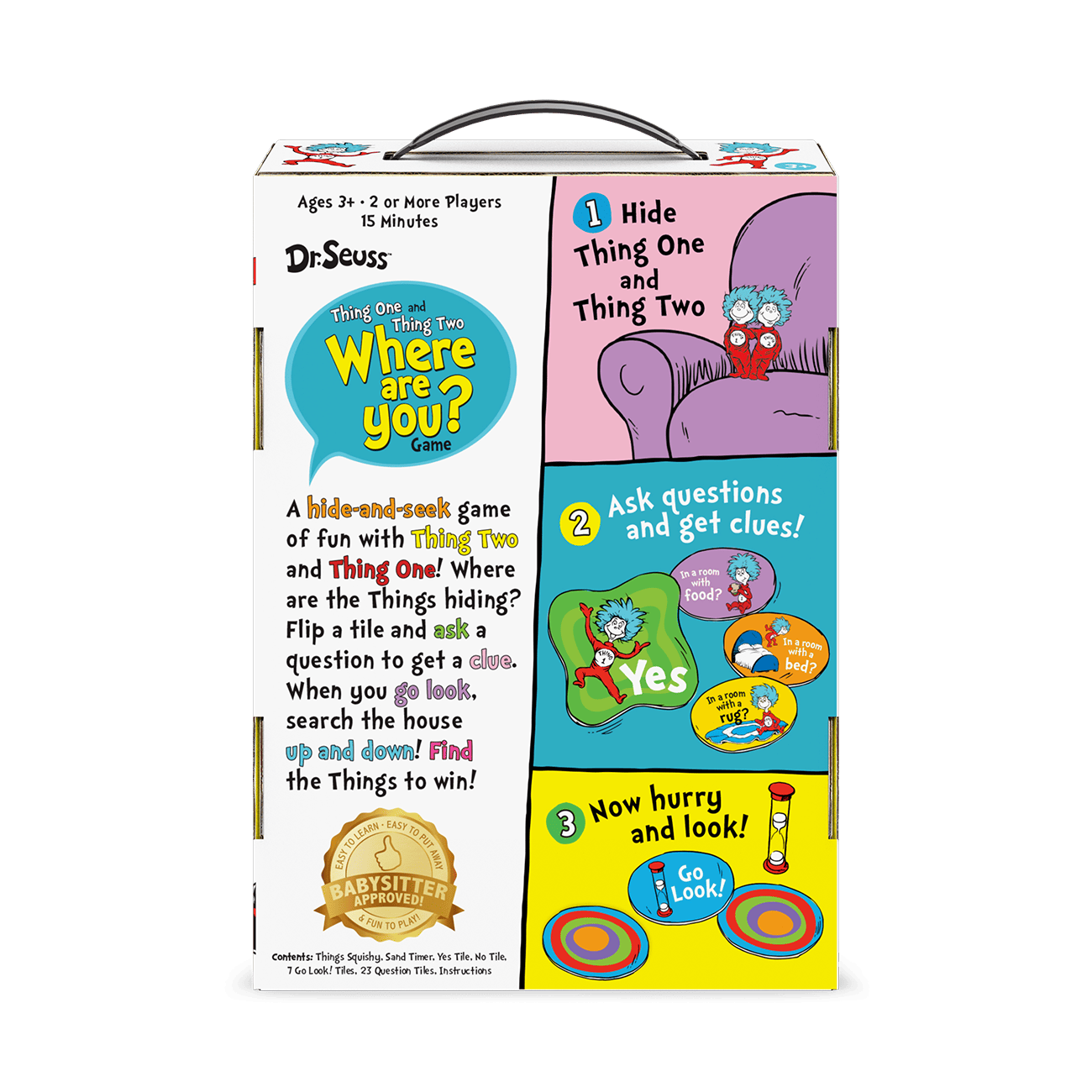 A hide-and-seek game of fun with Thing One and Thing One! Where are the Things hiding? The Hider helps them find a good spot. Then the other players take turns flipping tiles, asking questions, and getting clues. When someone flips Go Look!, they search the house up and down! Find the Things to win!