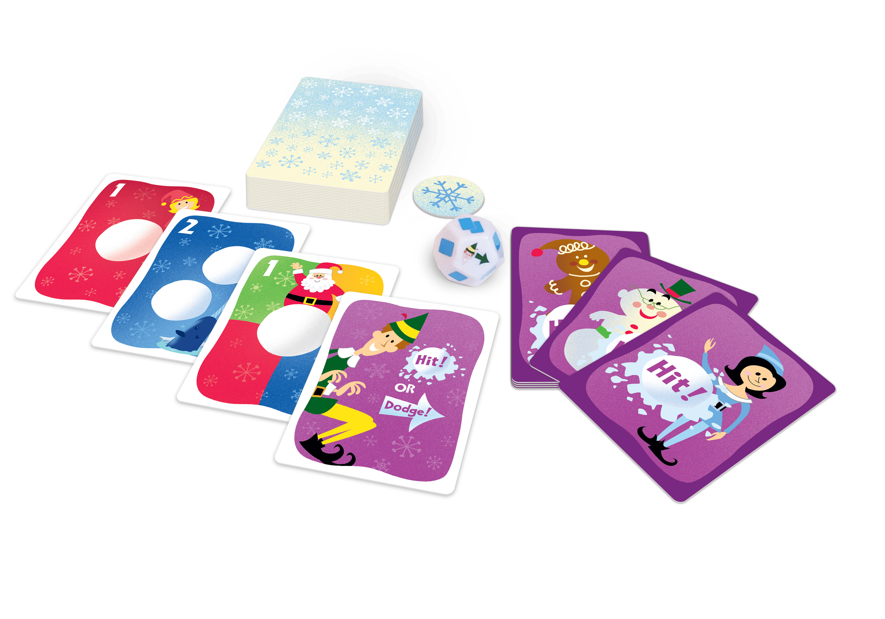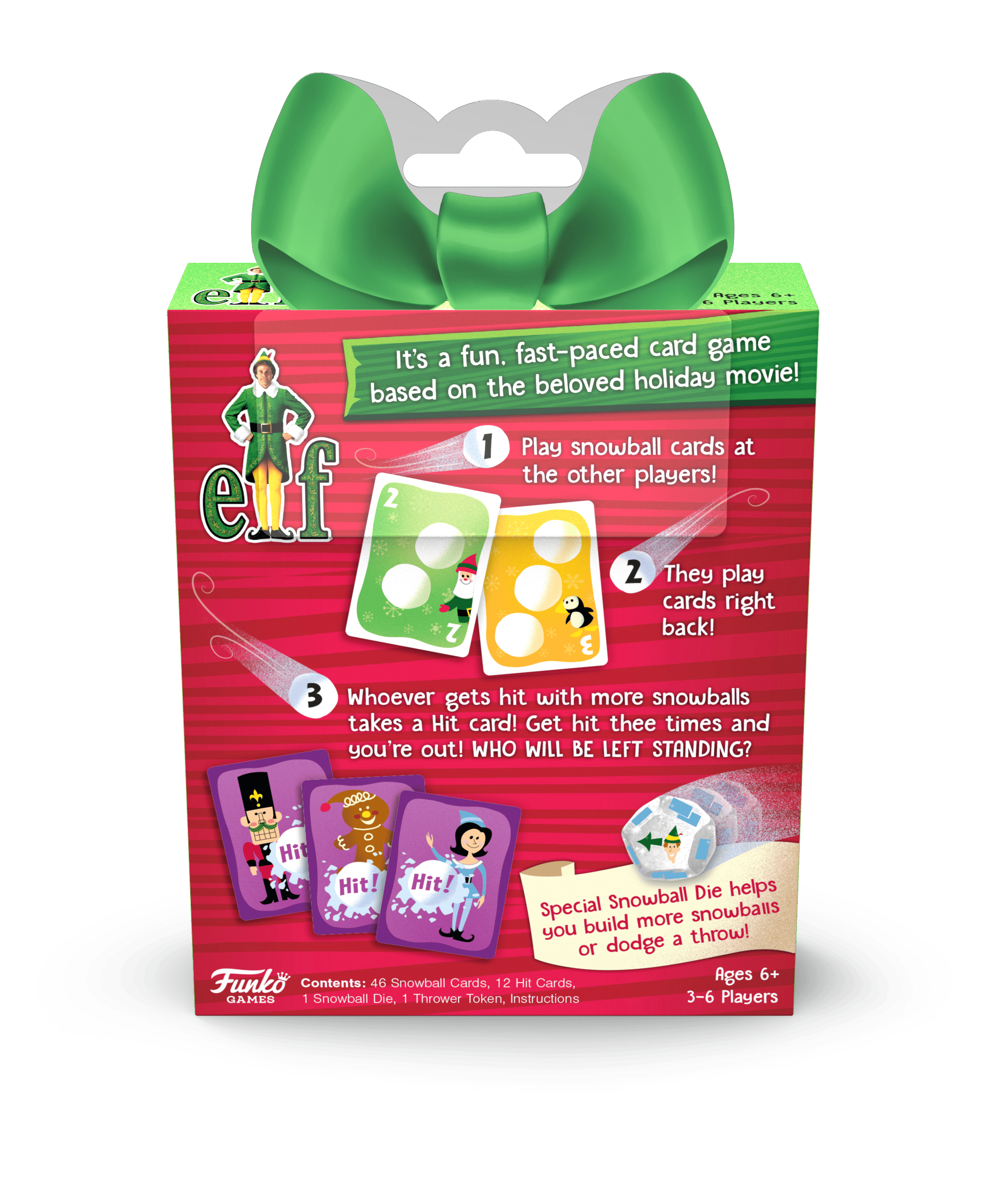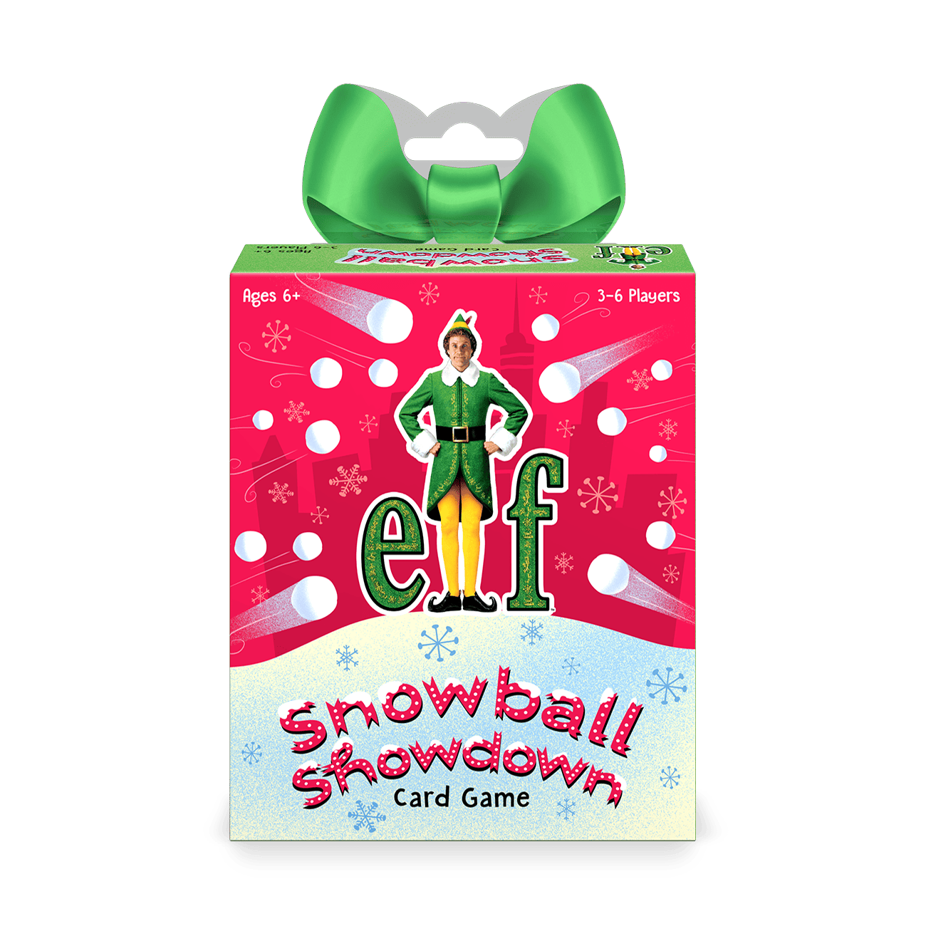 Join Buddy the Elf in a surprise snowball fight! "Throw" a set of like-colored snowball cards at another player and they can return fire! When you're the target, roll the jumbo snowball dice to dodge the icy barrage. When you get hit, take a snowball "splat" card-three hits and you're out. In this frigid fight, the last elf standing wins!