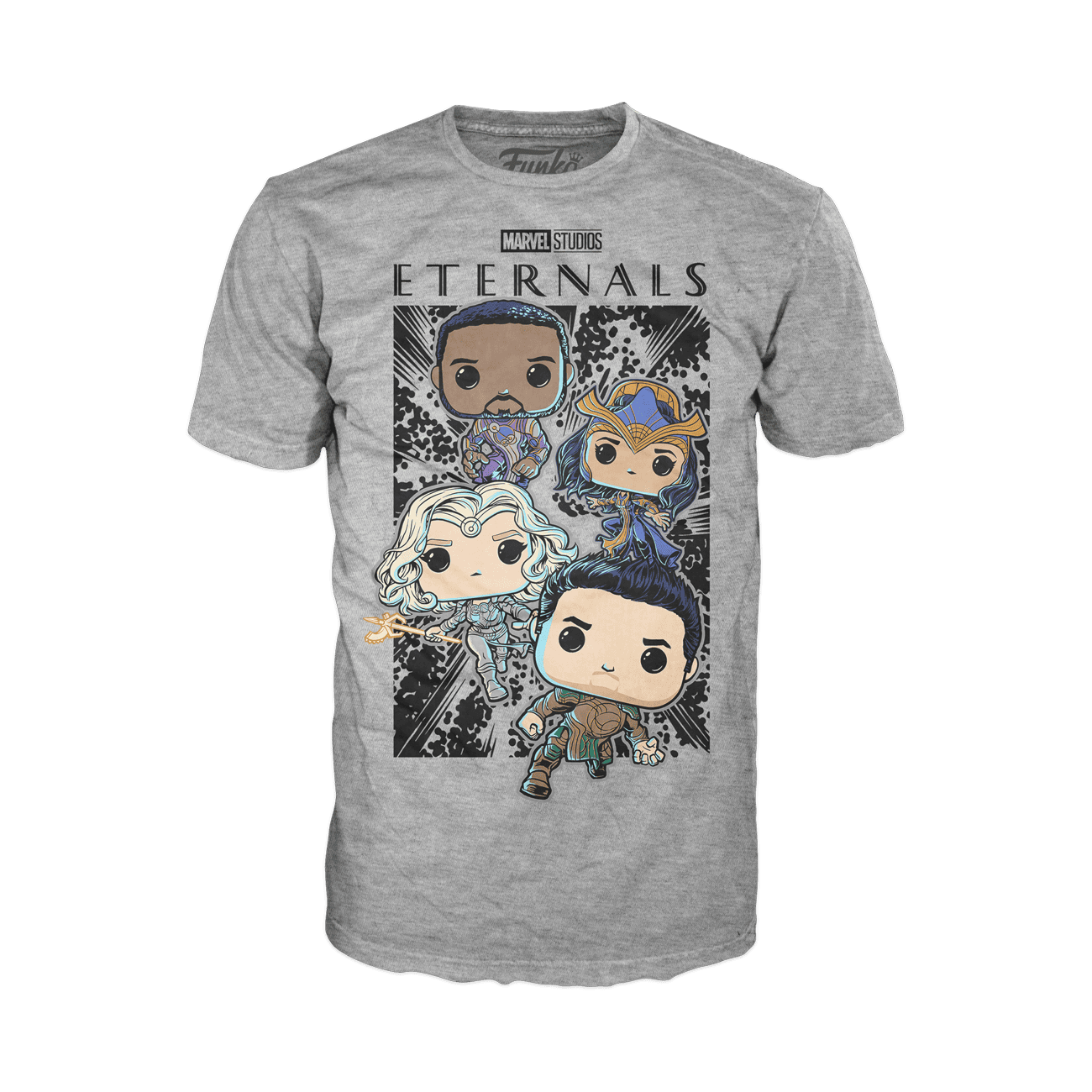 The Eternals live hidden among humans, but you can help them emerge from hiding by wearing the Eternal Four Group Pop! Tee. This sport grey, crewneck tee will become a go-to tee in no time. This versatile shirt pairs well with a wide variety of casualwear options and adds a fun pop culture touch to your wardrobe.