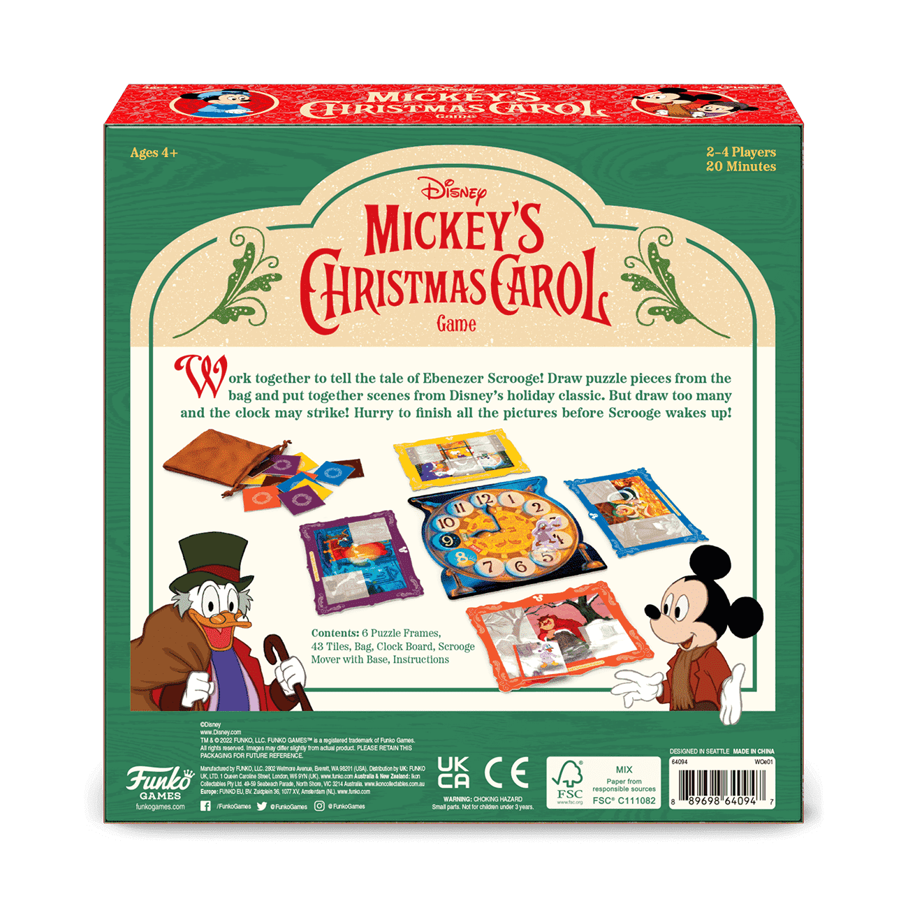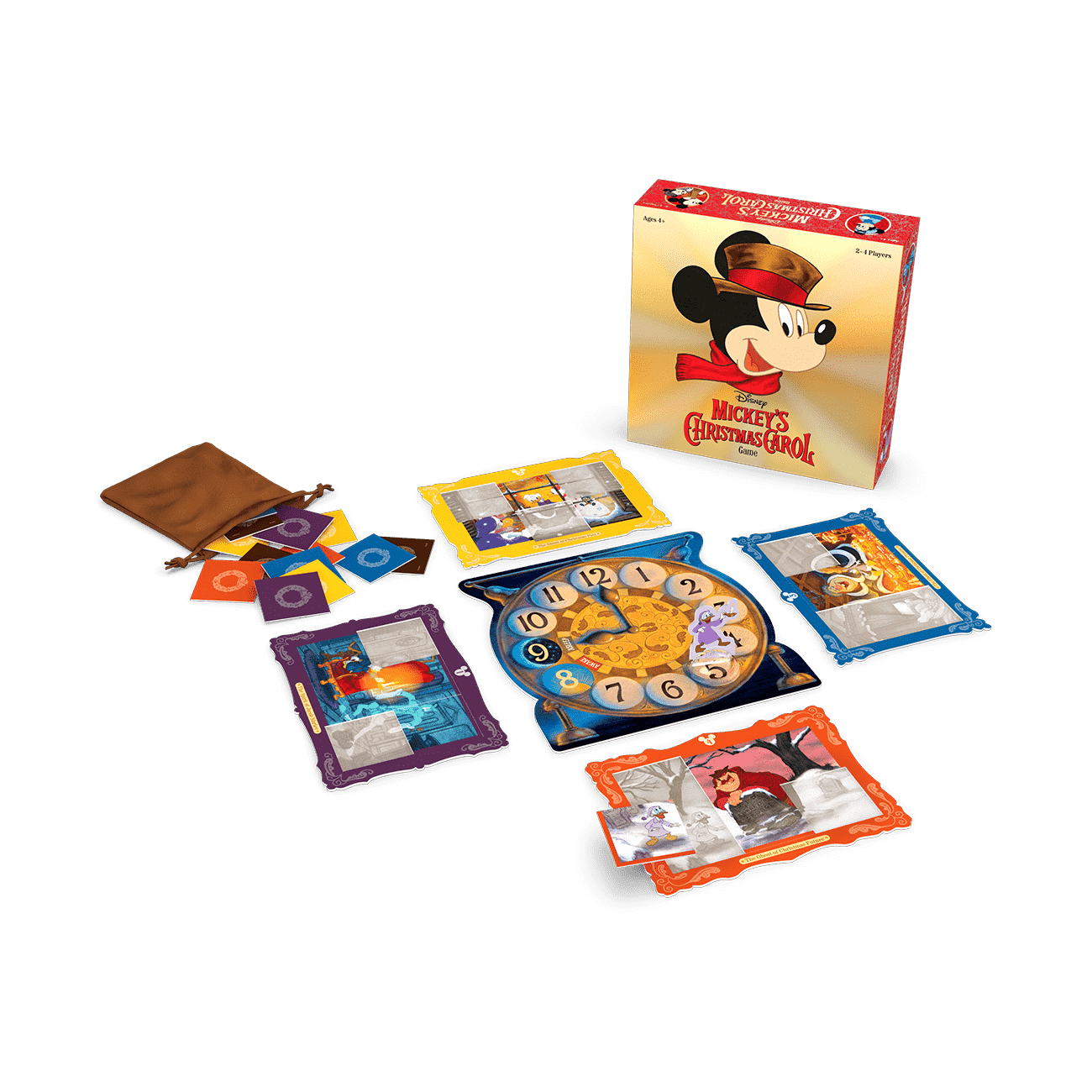 Work together to tell the tale of Ebenezer Scrooge! Draw puzzle pieces from the bag and put together scenes from Disney’s holiday classic. But draw too many and the clock may strike! Hurry to finish all the pictures before Scrooge wakes up!