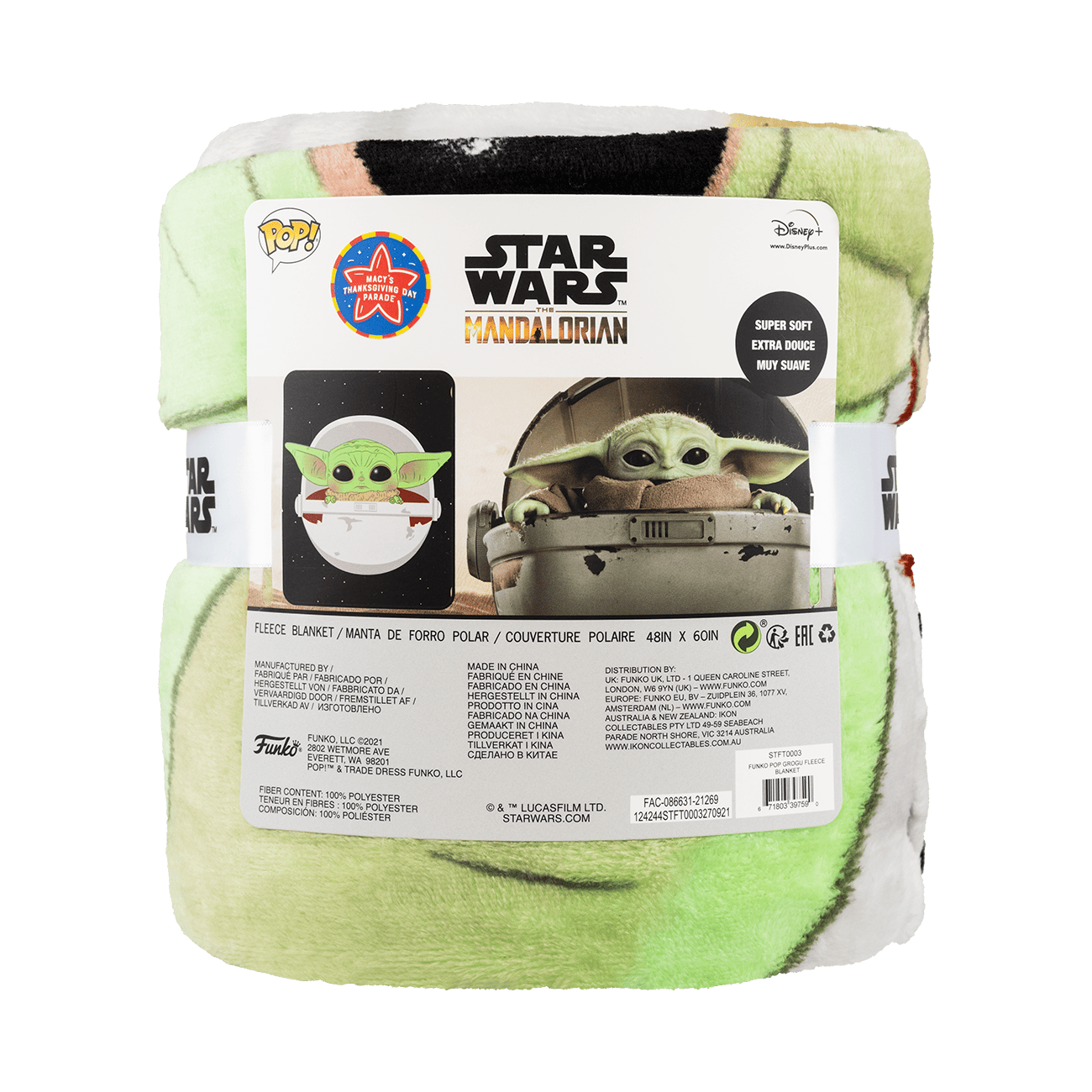 Cuddle up with the cutest bounty out there with the Grogu™ Fleece Throw. Every Jedi-in-training needs good rest and this cozy blanket will help cradle anyone to sleep. Act fast to get this Star Wars™ The Mandalorian™ Pop! Grogu Fleece Blanket before supplies run out! Made of polyester. Blanket is approximately 48” wide by 60” long.