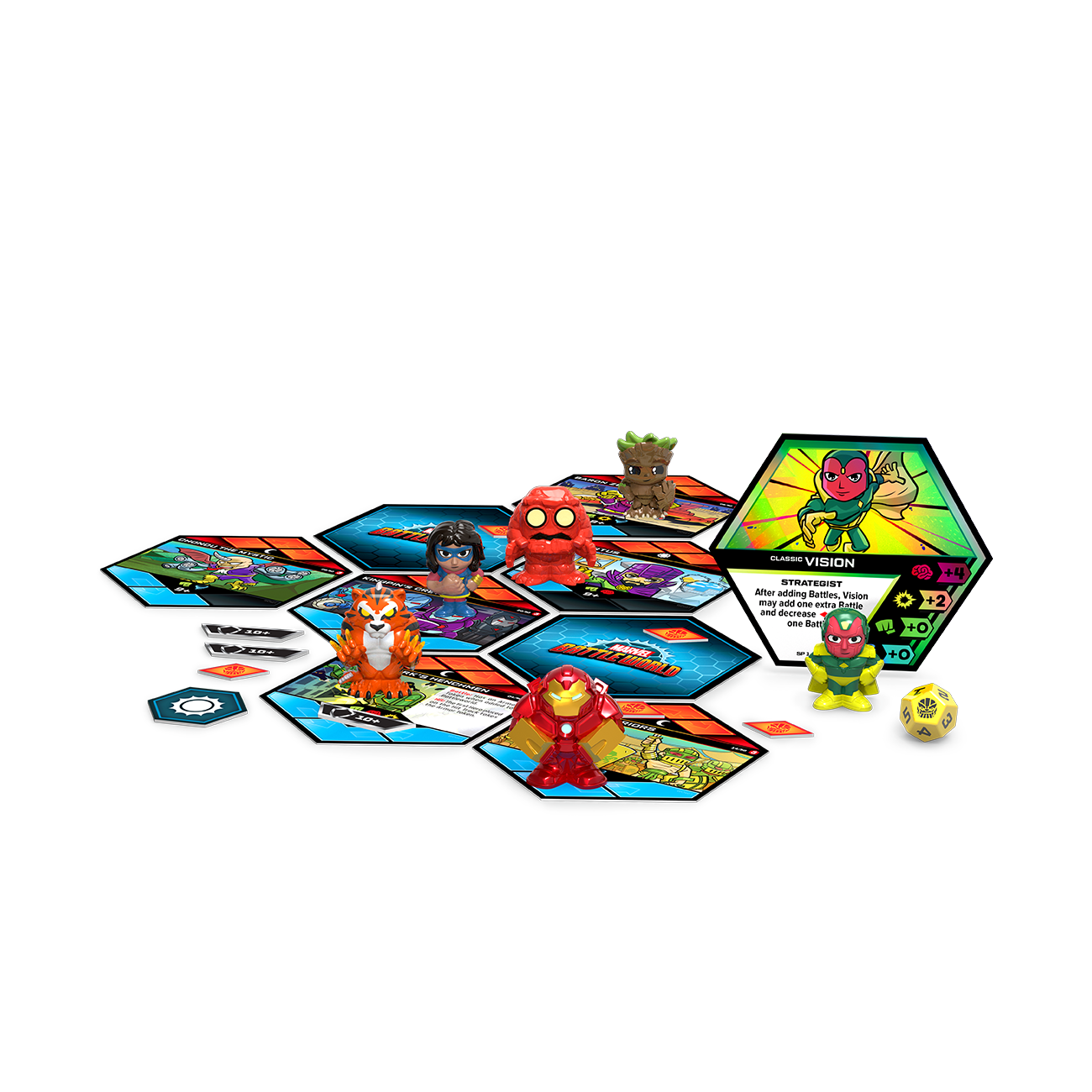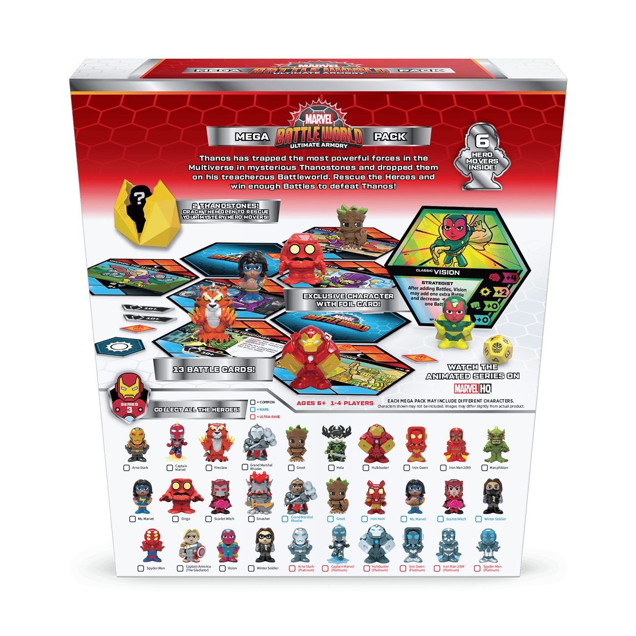 Pick your Heroes, rescue your friends, and win enough battles to defeat Thanos! Battleworld is a revolutionary, cooperative, expandable, collectible adventure game featuring dozens of characters from across the Marvel Universe! As you play, crack open mysterious Thanostones to reveal the characters inside. There are more than 30 new characters to collect! This Mega Pack jumpstarts your collection with six characters, including two mystery Heroes trapped in Thanostones and an exclusive Vision (Classic) with foil card!