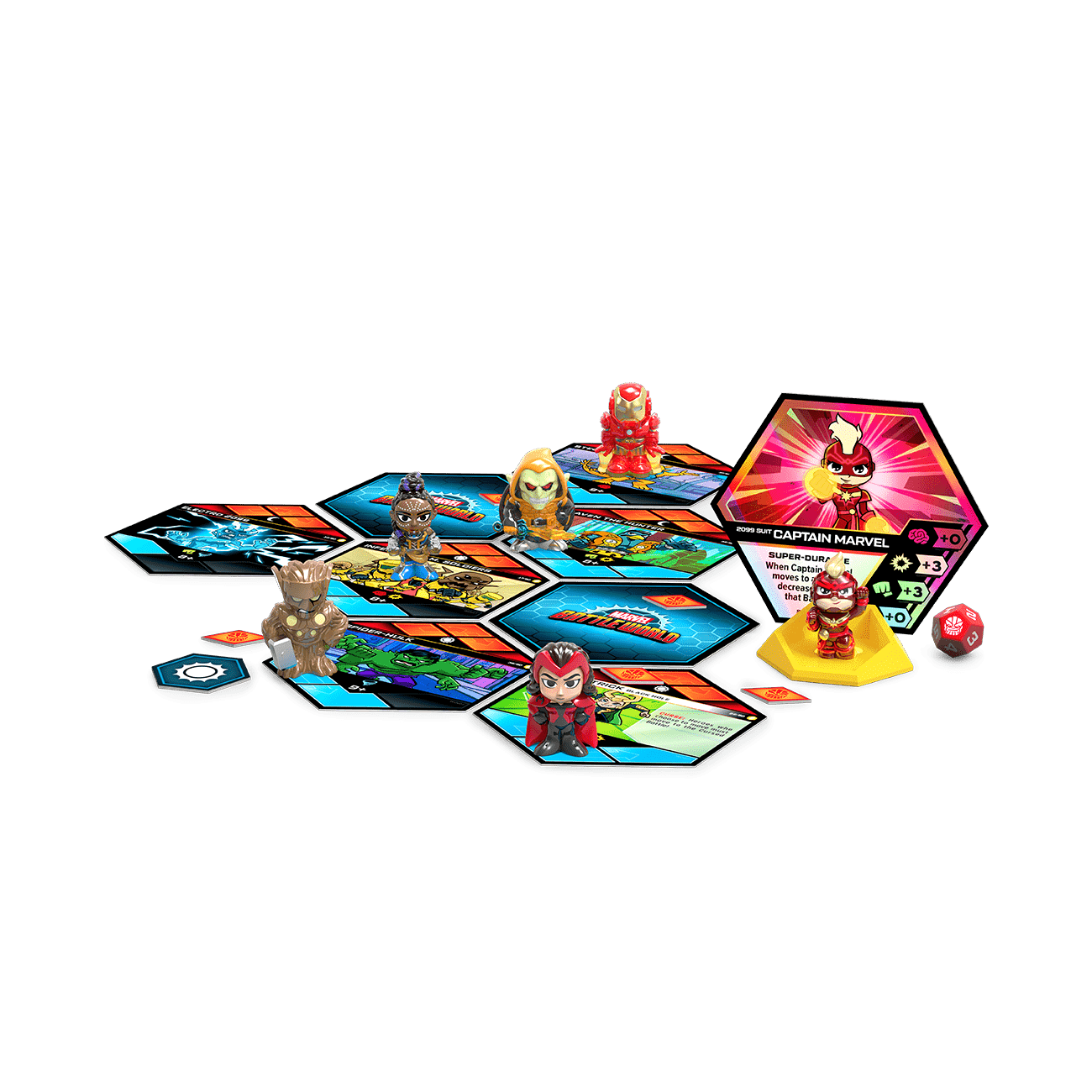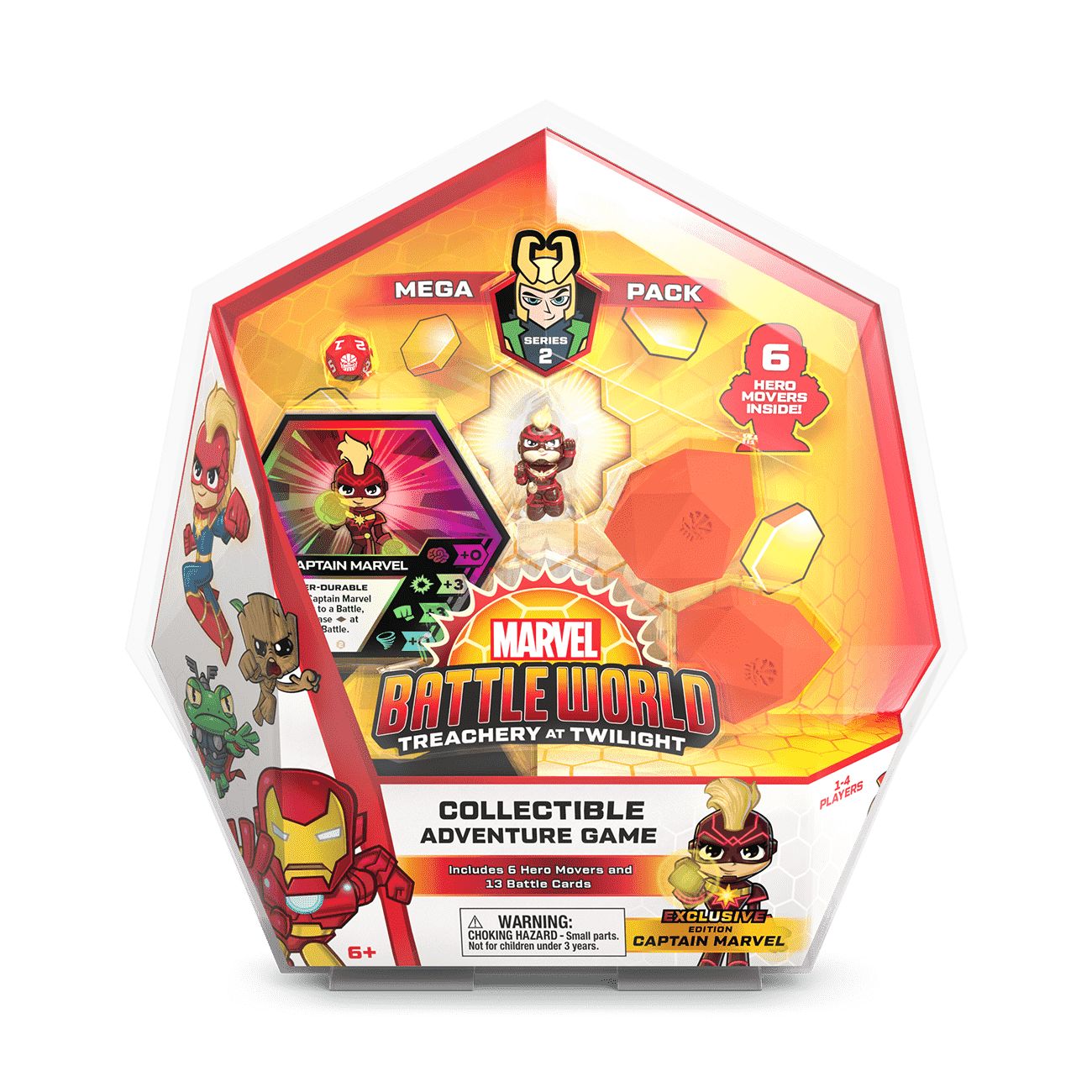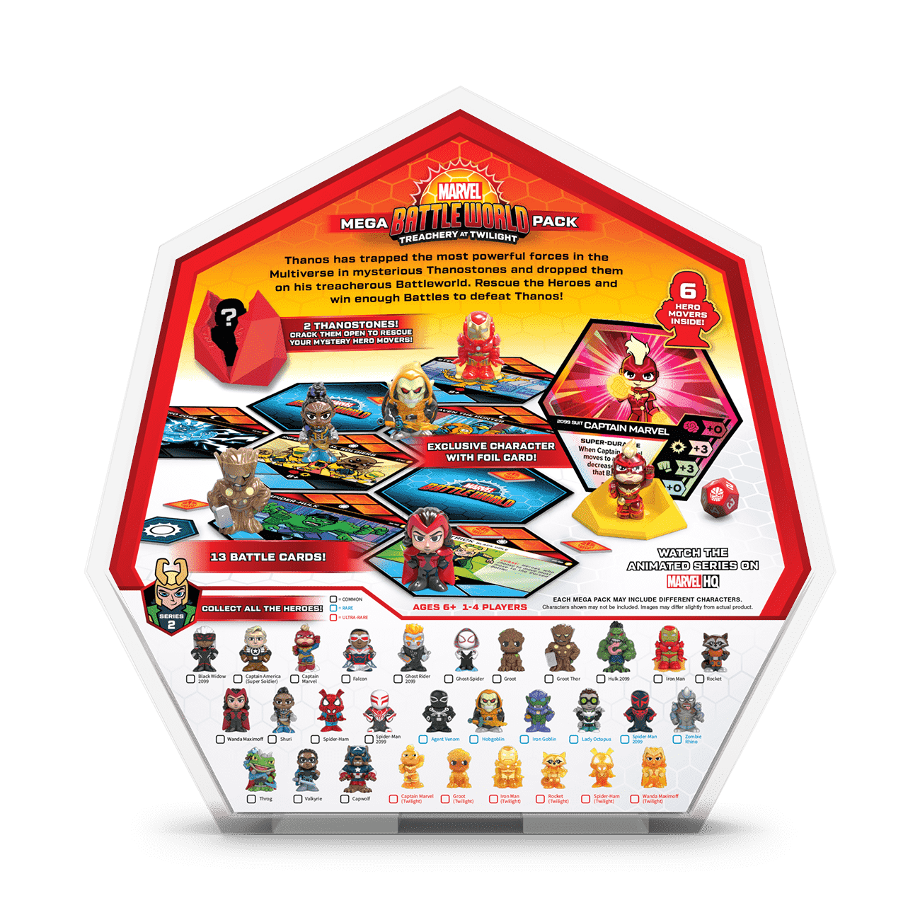 Pick your favorite Hero, rescue your friends, and win battles to defeat Thanos! Battleworld is a revolutionary cooperative, expandable, collectible adventure game featuring dozens of characters from all over the Marvel Universe! Players get to crack open the mysterious Thanostones during the course of play to reveal the mystery character inside for a constant sense of surprise and delight! Mega Packs let you jumpstart your collection with six characters: four starting Heroes [including an exclusive Captain Marvel (2099 Suit) variant] and two more trapped in Thanostones!