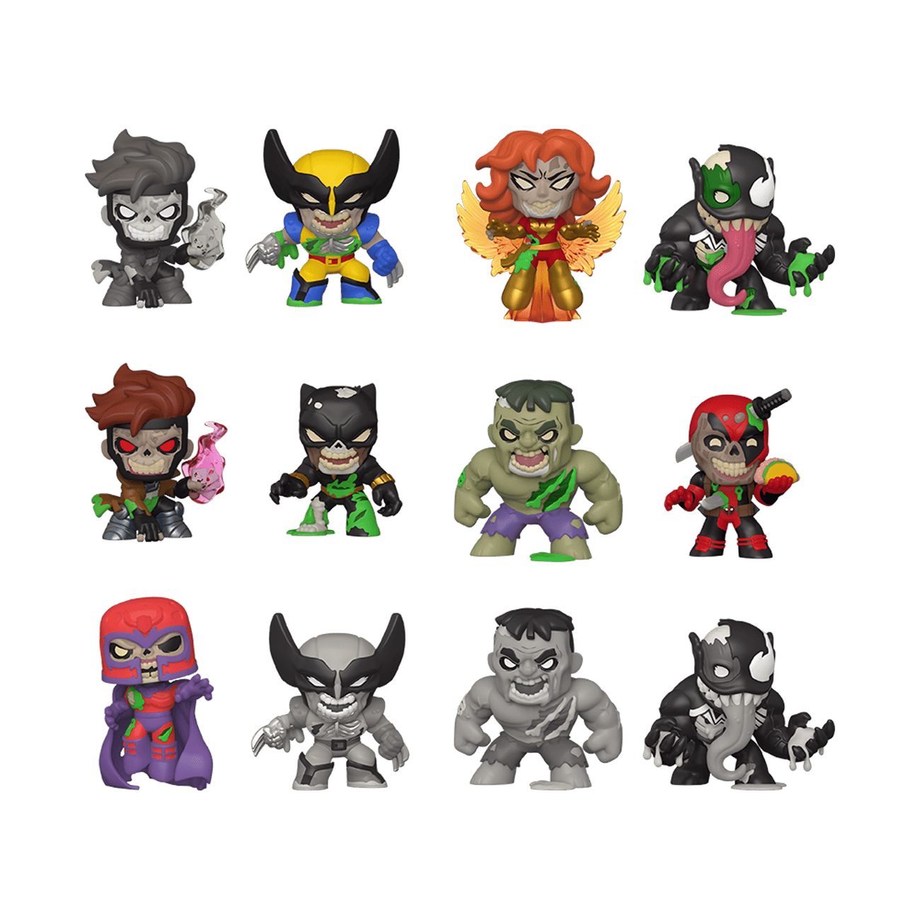 Consumed by their hunger, the Marvel Zombies have found a way to open a dimensional portal to find their way to new prey in your Mystery Mini collection. Which zombie will break through into your collection first? There's Zombie Deadpool, Zombie Magneto, Zombie Wolverine, Zombie Hulk, Zombie Dark Phoenix, Zombie Black Panther, Zombie Gambit, and Zombie Venom. Please note: We cannot accept requests for specific items. Item selection is random, as each piece is in blind packaging. You may receive duplicate figures.Vinyl figure is maximum 3 in (7.6 cm) tall, height varies depending on figure.