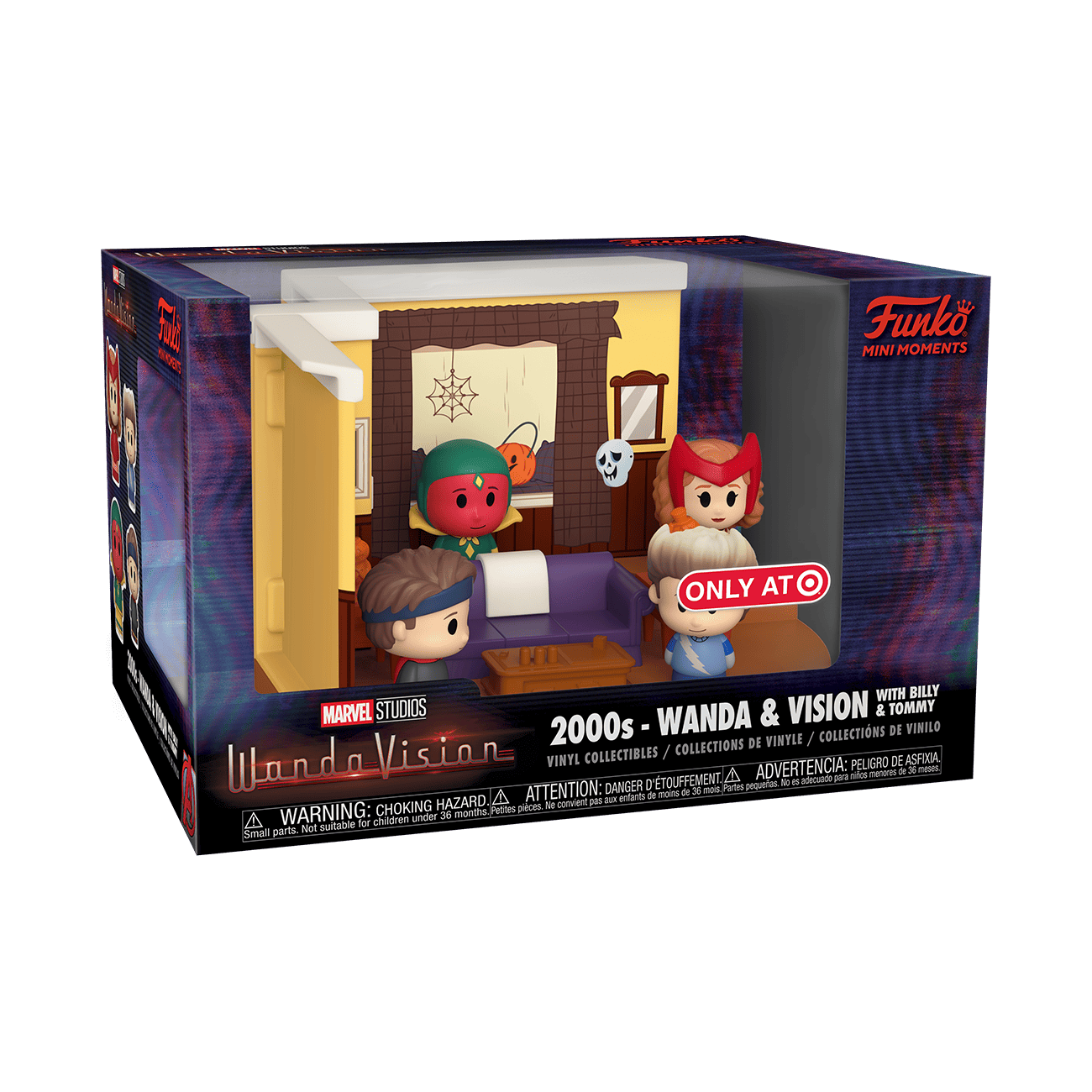 Make Halloween memories with Wanda and Vision with this exclusive Marvel Studios’ Wanda & Vision 2000s Pop! Mini Moments. Enter Wanda & Vision’s living room, which is decorated for Halloween. Pop! Wanda, Pop! Vision, Pop! Billy and Pop! Tommy have gathered, wearing retro costumes. Help them hold onto this family bonding moment and add them to your set. Collect Pop! Mini Moments to re-create scenes of your favorite Marvel characters, movies, and shows. Vinyl bobbleheads are approximately 1.5-inches tall, while set piece is approximately 3.75-inches tall and 5.25-inches wide