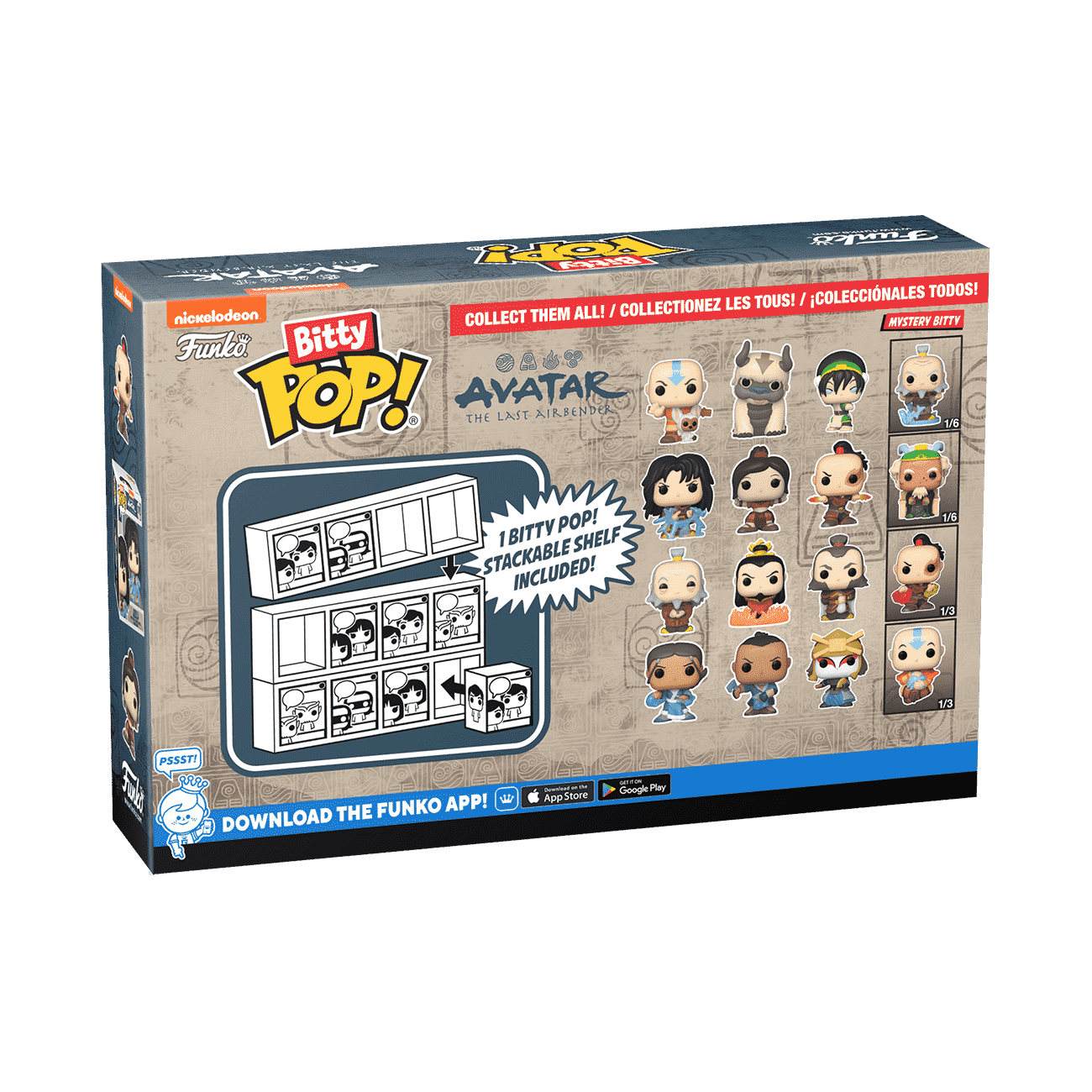 Your favorite Avatar: the Last Airbender™ Pops! have been shrunk into Bitty Pops! Expand your collection with this assortment of Bitty Pop! figures featuring your most beloved benders, non-benders, and critters as miniaturized figures! This 4-pack includes Bitty Pop! Katara, Bitty Pop! Sokka, Bitty Pop! Suki, and a mystery Bitty Pop! figure. The possible mystery Bitty Pops! are Hyper Rare (1/6) Iroh with lightning, Hyper Rare (1/6) King Bumi, Rare (1/3) Zuko, and Rare (1/3) Aang (floating).