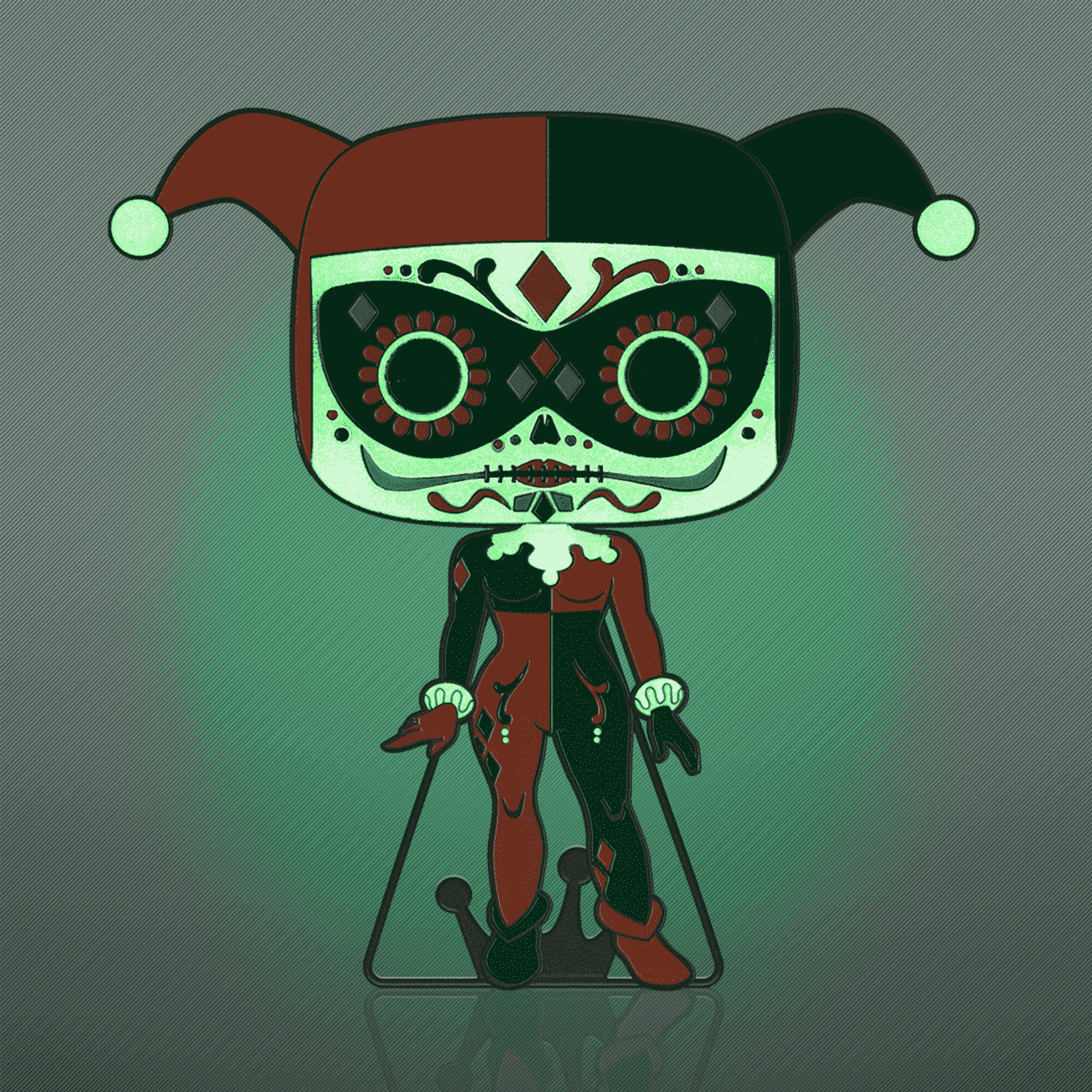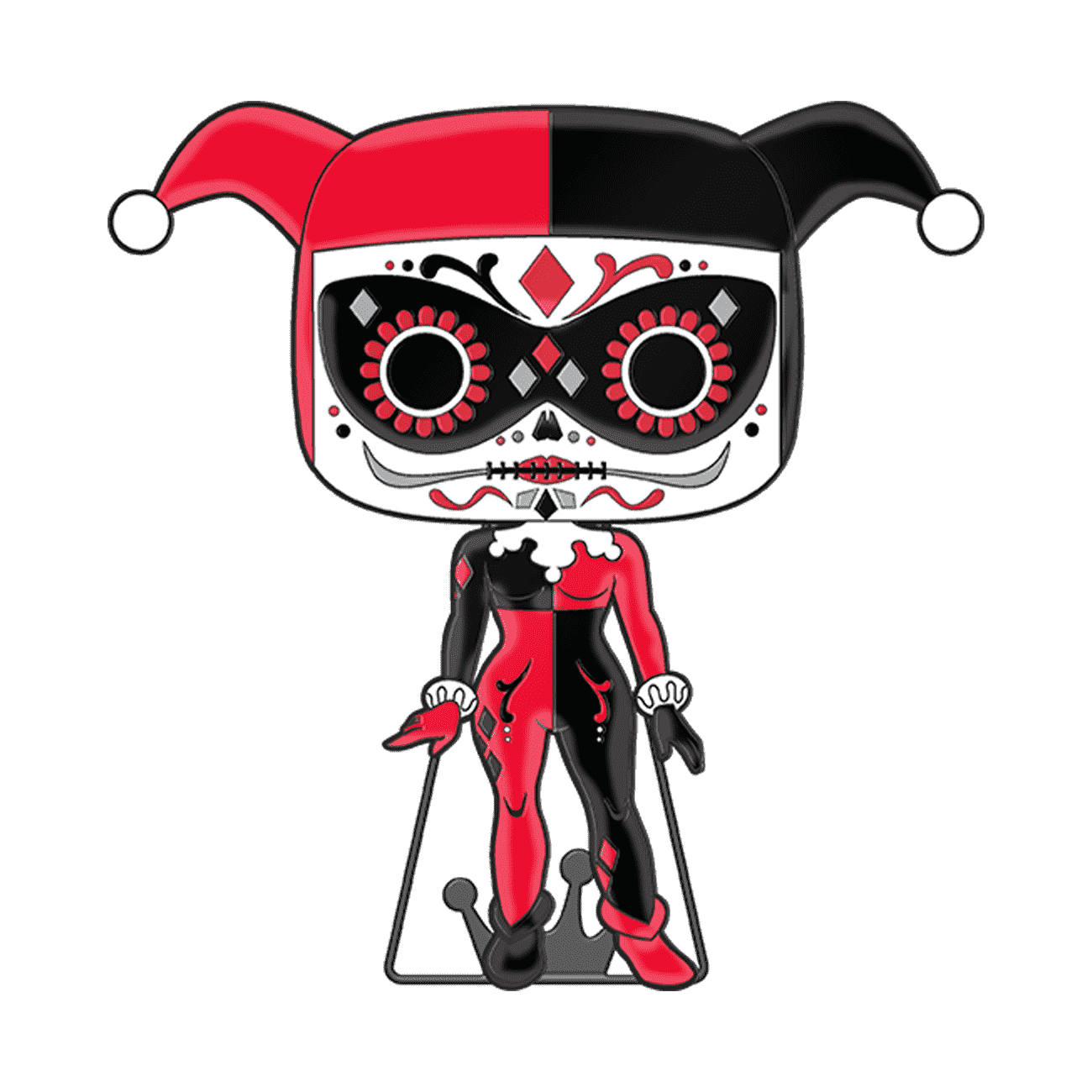 Decorate for your holiday traditions with a fun pop culture twist. It's the slightly spooky, colorful Dia De Los DC Pop! Pin collection. Start your Dia De Los DC set with the glow-in-the-dark Pop! Pin Harley Quinn. Bring home Dia De Los DC Pop! Pin Harley Quinn to bring a pop of color and light into your display. Enamel pin features shiny black-colored hardware and a built-in stand. Pin is approximately 4 in (10.2 cm) tall.