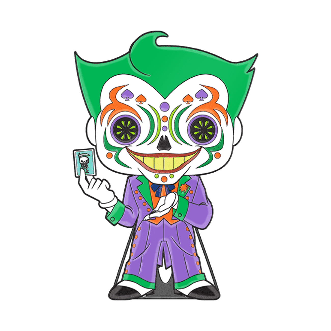 Decorate for your holiday traditions with a fun pop culture twist. It's the slightly spooky, colorful Dia De Los DC Pop! Pin collection. Start your Dia De Los DC set with the glow-in-the-dark Pop! Pin The Joker. Bring home Dia De Los DC Pop! Pin The Joker to bring a pop of color and light into your display. Enamel pin features shiny black-colored hardware and a built-in stand. Pin is approximately 4 in (10.2 cm) tall.