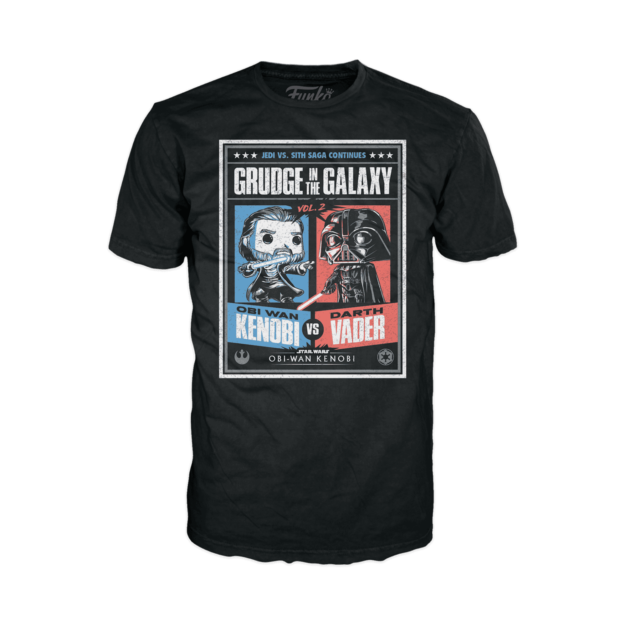Round two of the Grudge in the Galaxy match has begun, and you have ring-side seats. Capture the moment when Pop! Obi-Wan Kenobi and Pop! Darth Vader face each other on this Star Wars Obi-Wan Kenobi Pop! Tee. On the front of this crew neck black tee, Pop! Obi-Wan Kenobi, who is bathed in blue light, and Pop! Darth Vader, who stands against a red background, draw their lightsabers. Above them, the words “Jedi vs. Sith Saga Continues” appear, along with the title of the match: Grudge in the Galaxy, vol. 2.