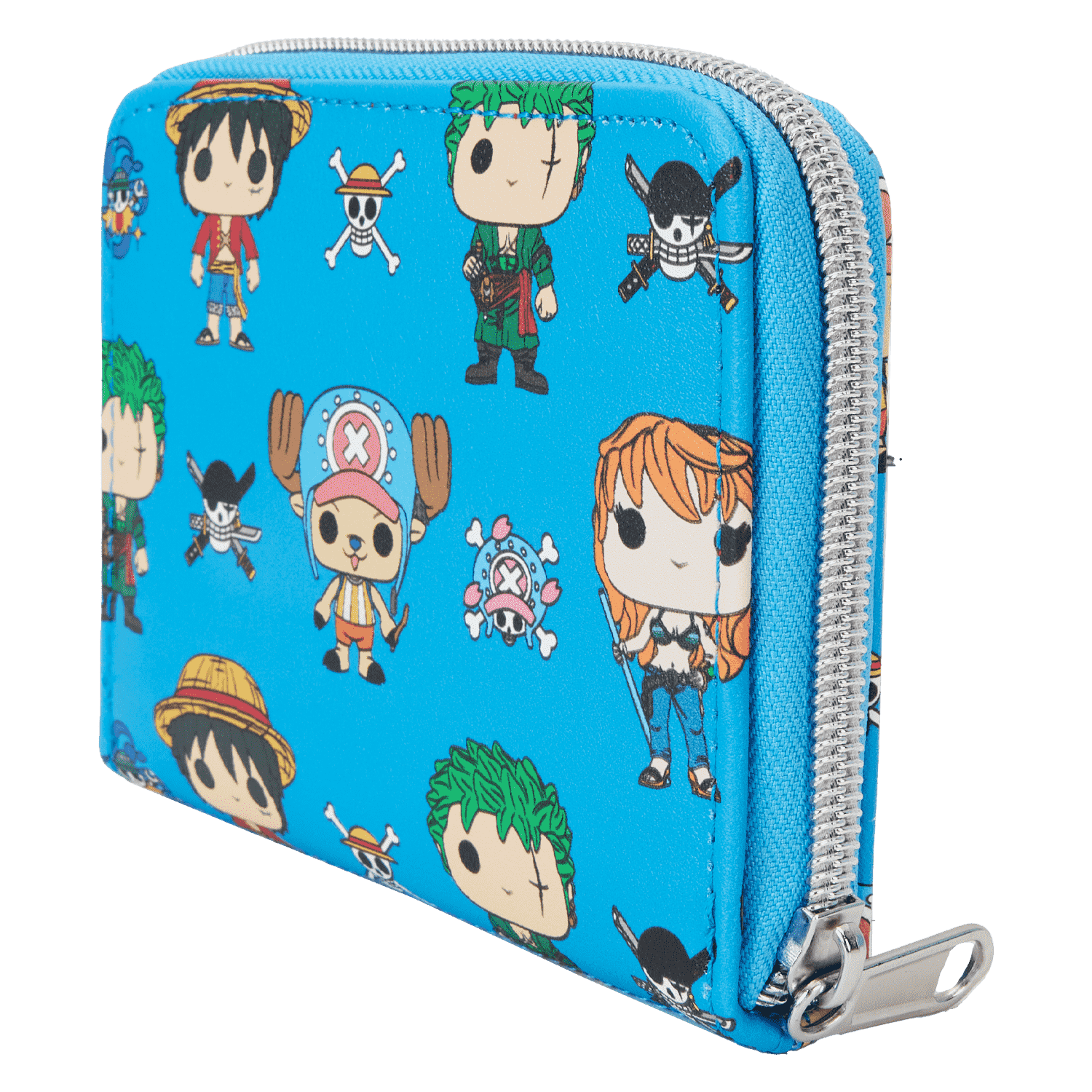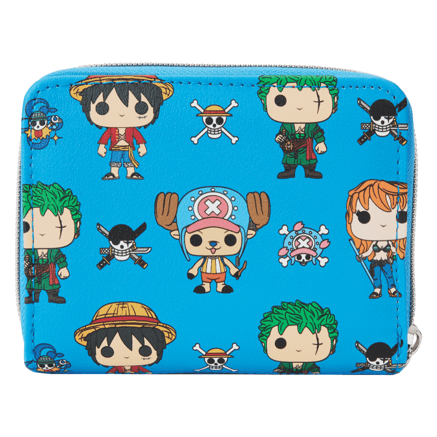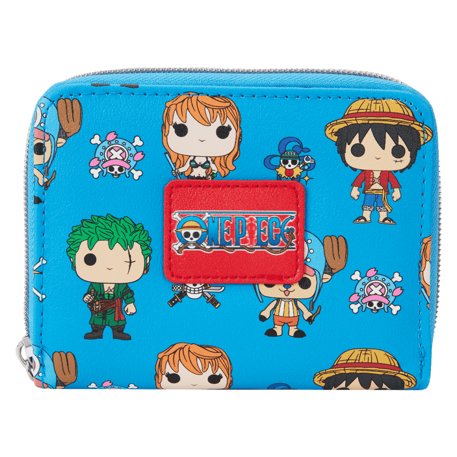 The One Piece Straw Hat Crew Funko Wallet is made of vegan leather (polyurethane). Wallet zips closed with sturdy metal hardware and features printed details.