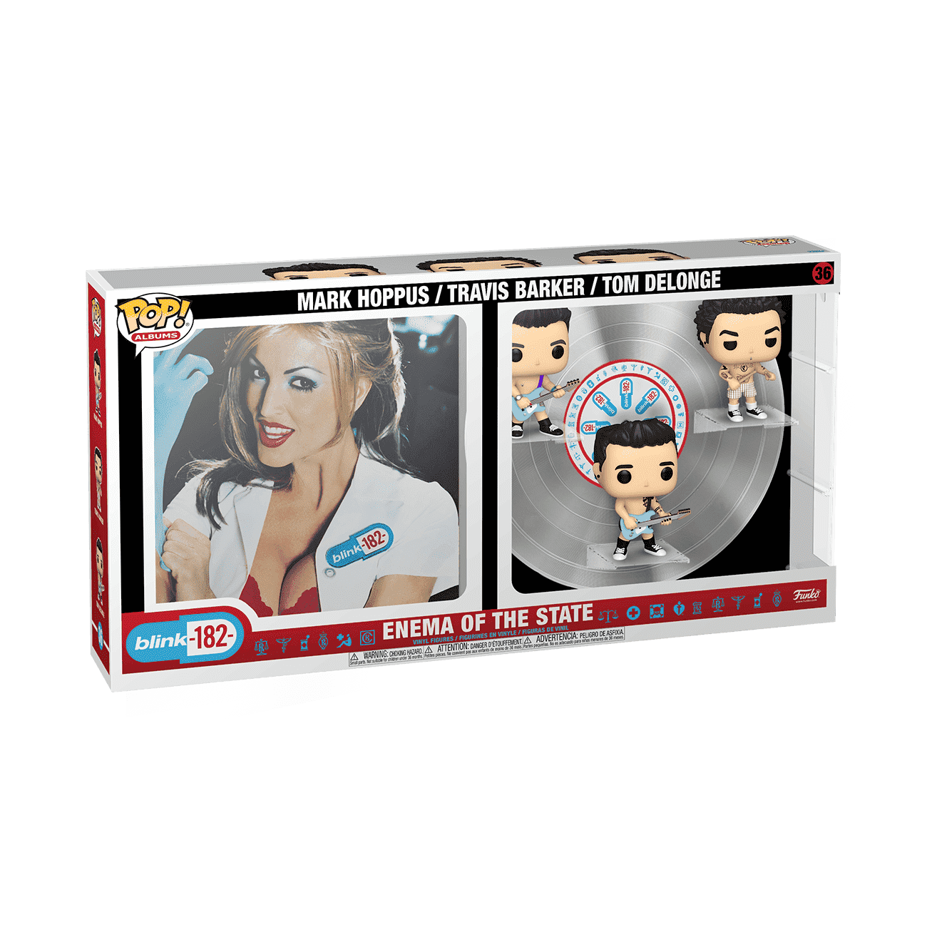 Put a spin on your Pop! Music set with this exclusive Enema of the State Pop! Albums Deluxe collectible. Rock on with Blink-182 Pops! Mark Hoppus, Travis Barker, and Tom Delonge while commemorating the 1999 release of the chart-topping album, Enema of the State. These Pops! stand on platforms around a record-backdrop, and next to them, the cover for Enema of the State is recreated in full color.