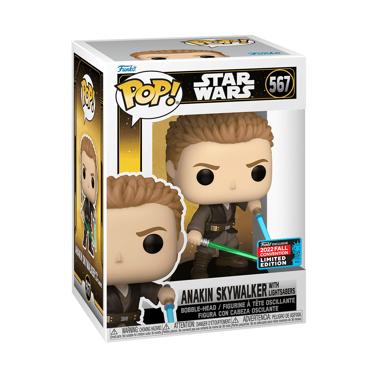 Double the stellar pull of your Star Wars™ set with Pop! Anakin Skywalker, holding two lightsabers. This 2022 New York Comic-Con exclusive Pop! Anakin Skywalker has him holding a clear blue lightsaber in one hand, and a clear green lightsaber in the other. Bring home a piece of the Star Wars™ saga for a galaxy of adventures. Vinyl bobblehead is approximately 3.96 in (10.1 cm) tall.