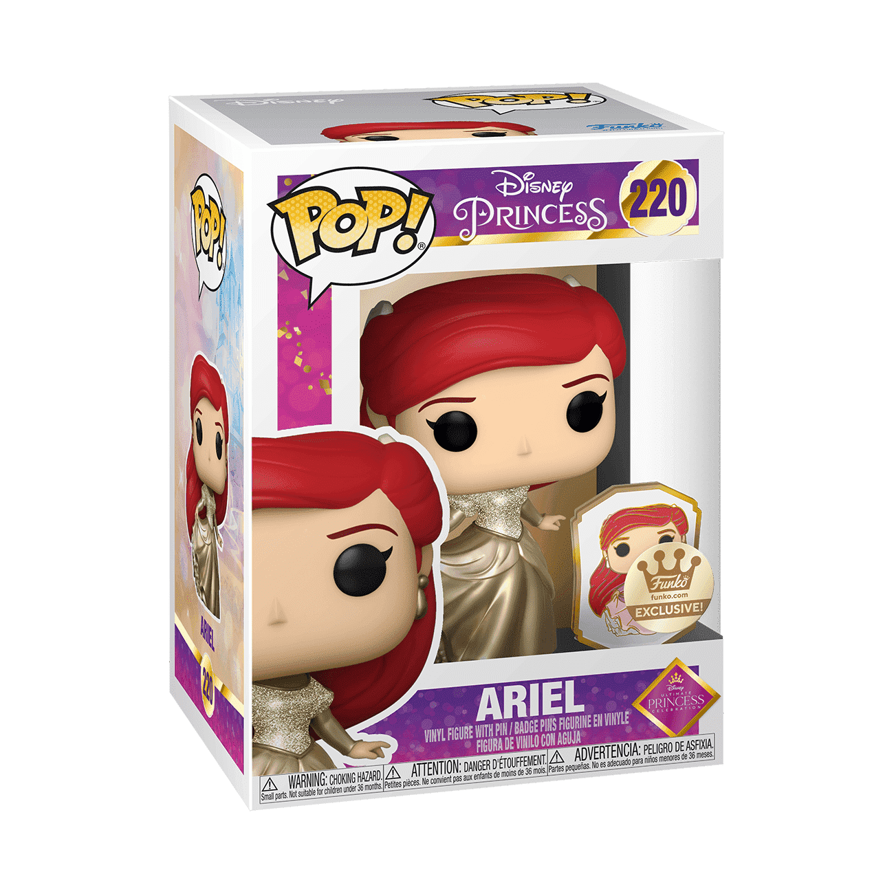Disney is hosting the Ultimate Princess Celebration to inspire and empower you and your loved ones with stories of courage and strength. Collect your favorite Disney Princesses as Funko Pop! figures and complete your Disney Ultimate Princess collection with the Funko exclusive Pop! Ariel in a metallic gold dress with matching pin. Vinyl figure is approximately 4.75-inches tall. Enamel pin is approximately 1.5-inches tall.