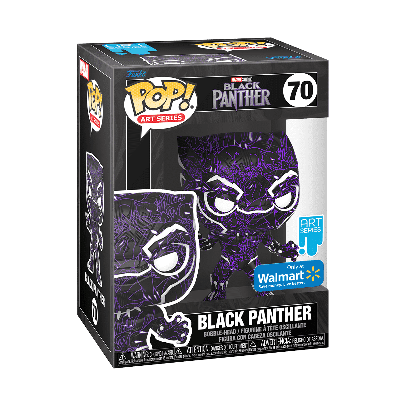 Accept the royal challenge! The Marvel Studios’ Black Panther Funko Art Series Legacy Collection awaits you! Bring home Walmart-exclusive Pop! T’Challa. Pop! T’Challa features an exquisite black panther pattern, interspersed with leaves, and electrified in a royal blue outline, designed by Jamaican-American comic book artist and writer, Damion Scott. Complete your set today! Vinyl bobblehead is approximately 4 in (10.2 cm) tall and comes prepackaged in a premium plastic Pop! protector.