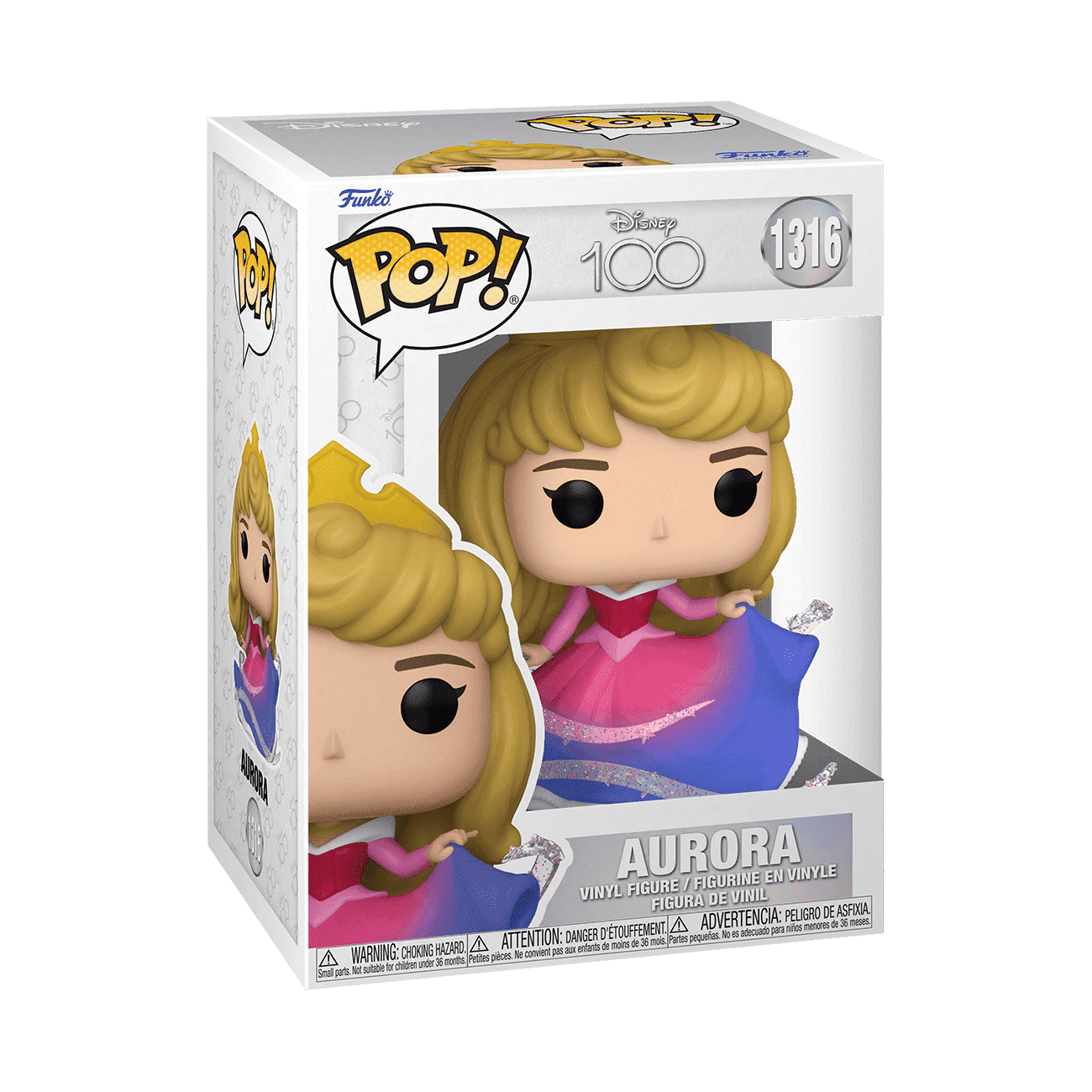 Pop! Aurora is dancing her way into her happily ever after with this dreamy gown—but her fairy godmothers can’t agree on the color. Celebrate Disney’s 100th Anniversary with this mid-transformation pink and blue dress. Swirls of magic shimmer around this graceful princess as she waltzes towards your Sleeping Beauty collection. Vinyl figure is approximately 4.5 in (11.4 cm) tall.