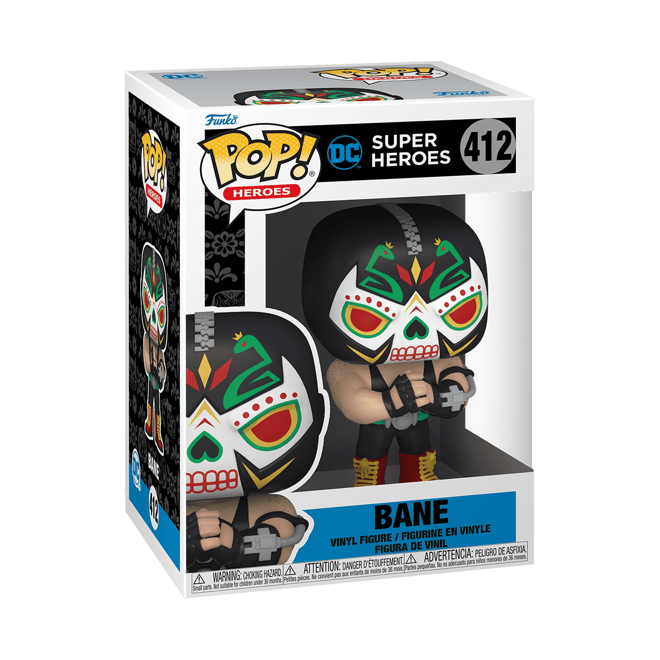 Decorate for your holiday traditions with a fun pop culture twist. It's the slightly spooky, colorful Dia De Los DC collection. Start your Dia De Los DC set with Pop! Bane. Vinyl figure is approximately 4 in (10.2 cm) tall.