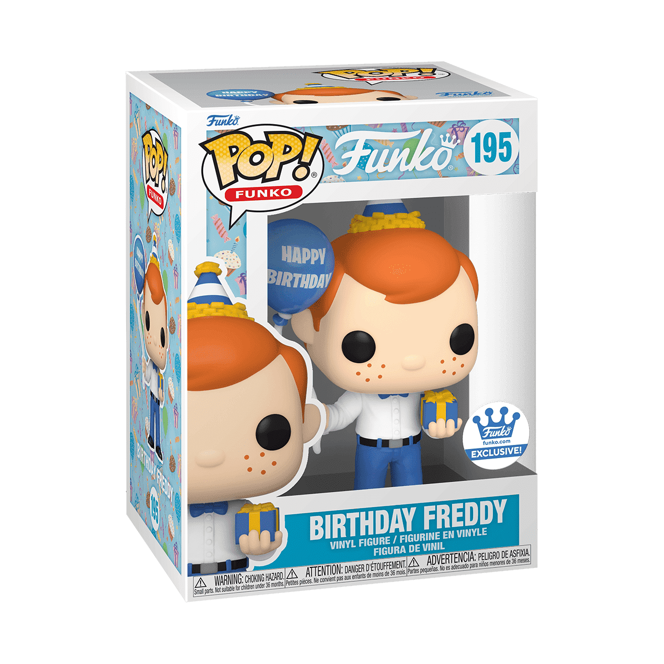 Celebrate with Funko Exclusive Pop! Birthday Freddy Funko! If there's one thing you should know about Freddy, it's that he's a fan of everything, especially birthday parties. Make this Birthday Freddy Funko Pop! the perfect companion for enjoying a delicious slice of cake. He’s all decked out in his party hat, blue bowtie, and he’s bringing a lovely present and blue balloon that says Happy Birthday. Vinyl figure is approximately 4.68 in (11.9 cm) tall.