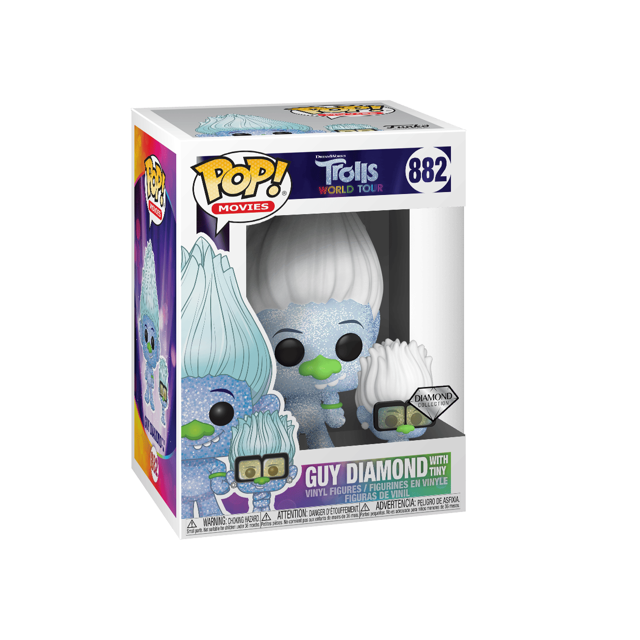 The troll tribes must fight to protect their musical ways of life. Collect this diamond glitter Pop! & Buddy of Guy Diamond and Tiny Diamond to unite the trolls of Trolls World Tour. Collectible stands 3.75-inches tall.