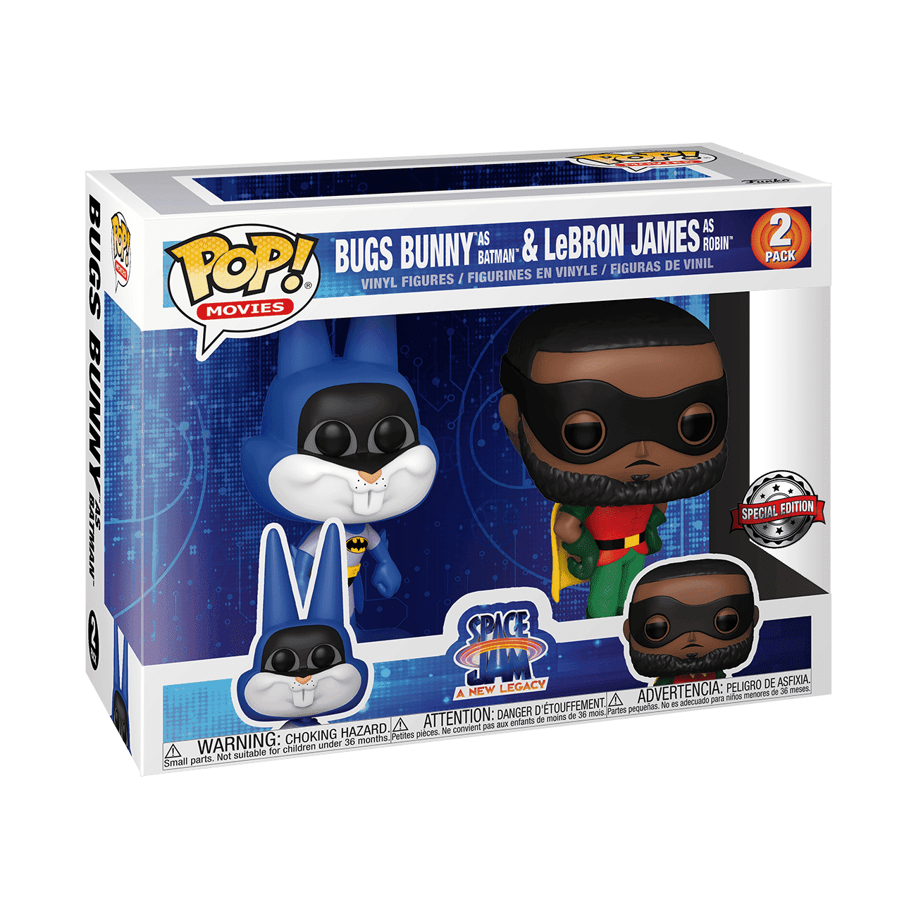 It's time to pick your team, hit the court, and save the day with the Space Jam: A New Legacy collection! Choose the Tune Squad over the Goon Squad by collecting this exclusive 2-Pack Pop! Bugs Bunny as Batman and LeBron James as Robin about to slam dunk. Vinyl figures are approximately 4.15-inches tall and 5.5-inches tall.