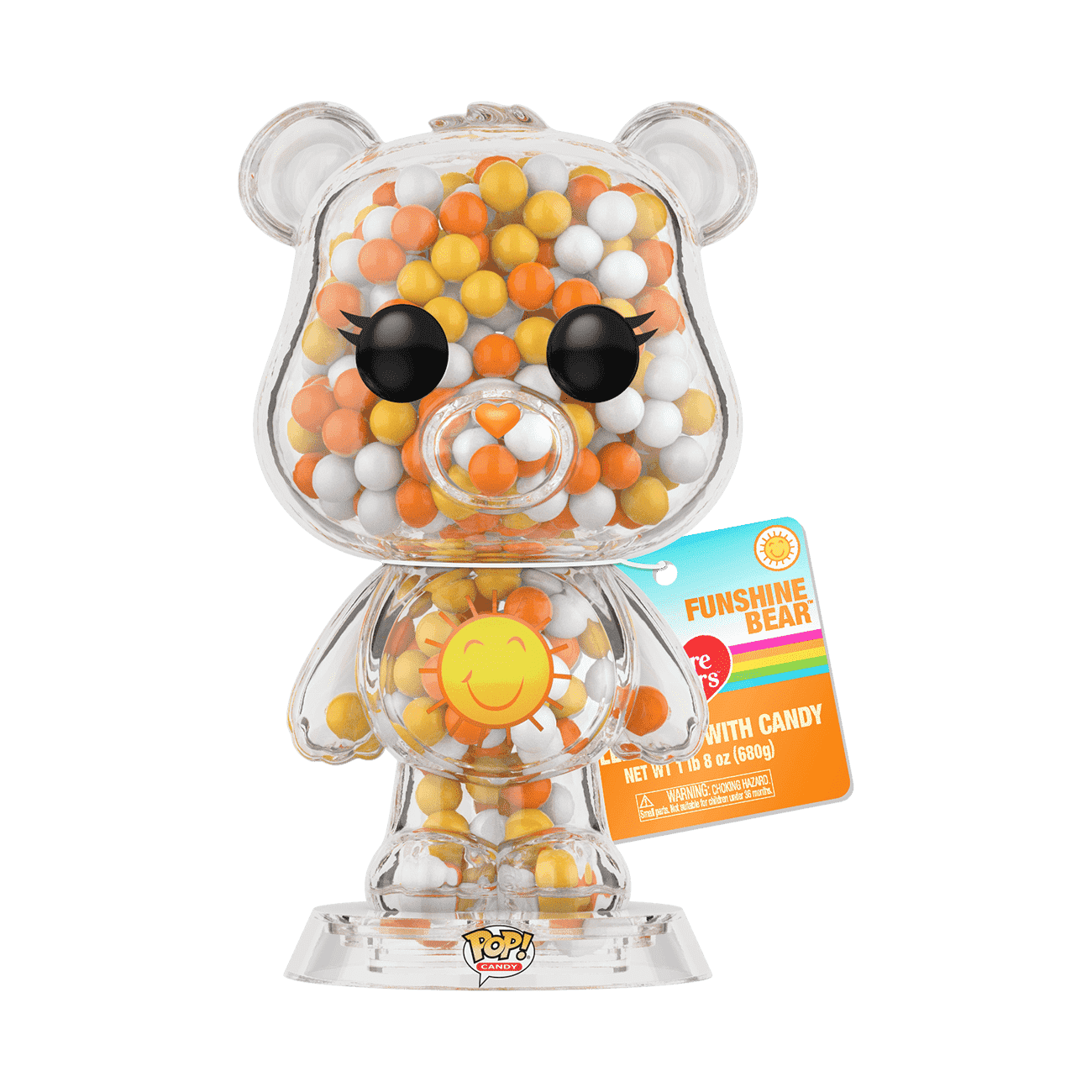 Treat your sweet tooth with Pop! Candy Funshine Bear™! This friendly bear is here to help brighten your day and energize your Care Bears™ set. This collectible features a clear, molded casing filled with vibrant orange, yellow, and white, pressed sugar candies! This candy container is made with BPA free plastic and snaps open at the figure’s base for on-the-go snacking convenience! Whether you choose to open and enjoy or display sealed, Pop! Candy figures will add a bit of flavor to your collection and your palate! Plastic figure is approximately 4.15 in (10.5 cm) tall.