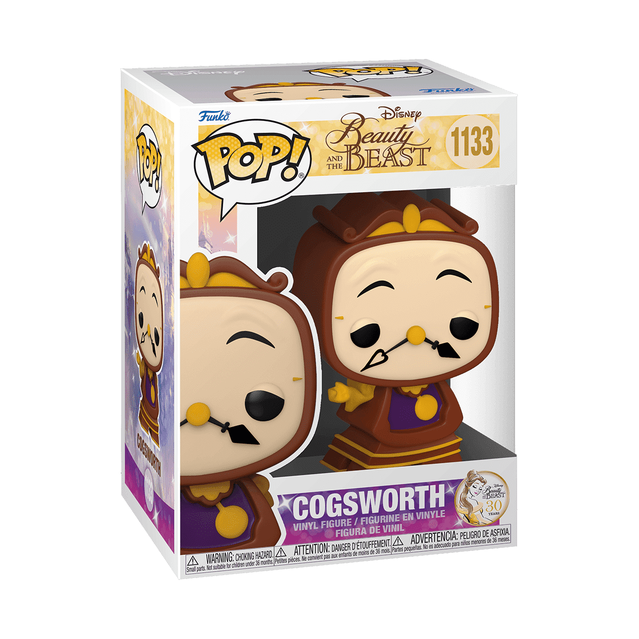 Celebrate the 30th Anniversary of the release of Disney's The Beauty and the Beast with Pop! Cogsworth. Turn the tables and have all The Beauty and the Beast 30th Anniversary Pop! collection be guests in your Disney display. Vinyl figure is approximately 3.75 in (9.5 cm) tall.