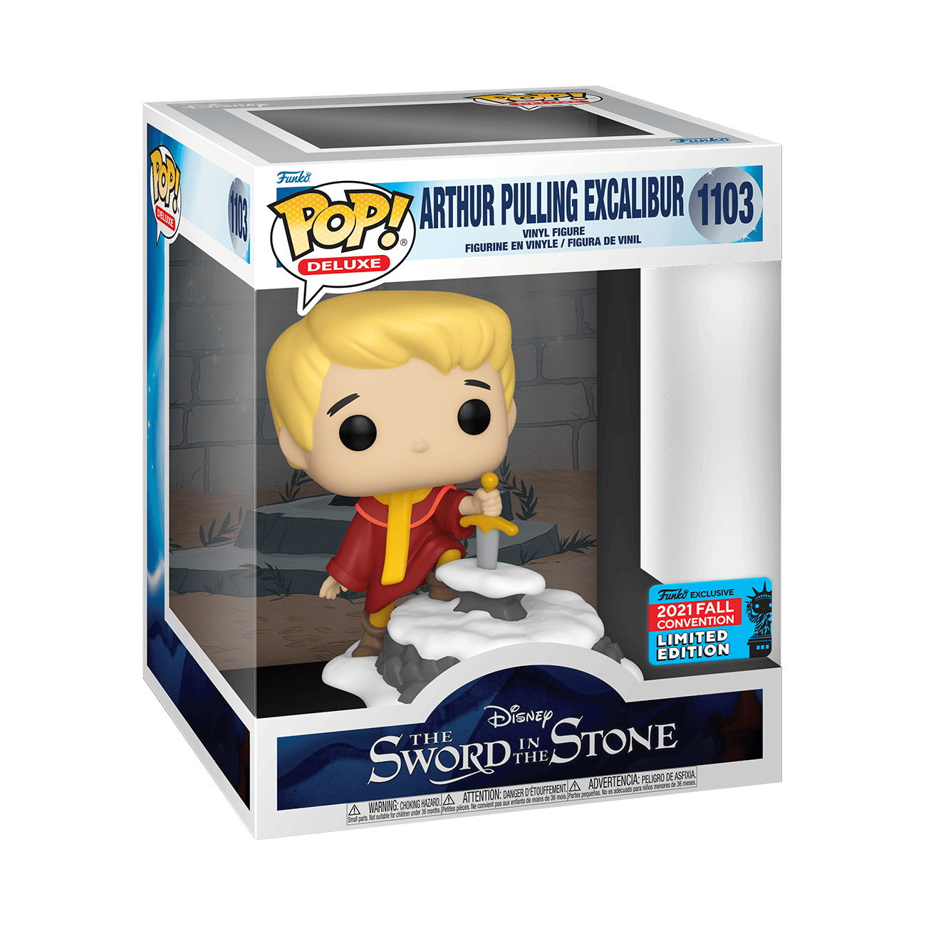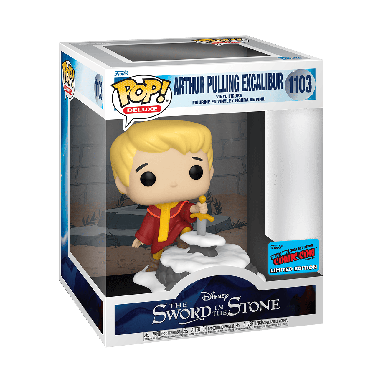 Go on a secret quest, a legendary adventure with the 2021 New York Comic Con exclusive Deluxe Pop! Arthur Pulling Excalibur! Complete your collection of The Sword in the Stone and fulfill the prophecy. Vinyl figure is approximately 4 in (10.2 cm) tall.