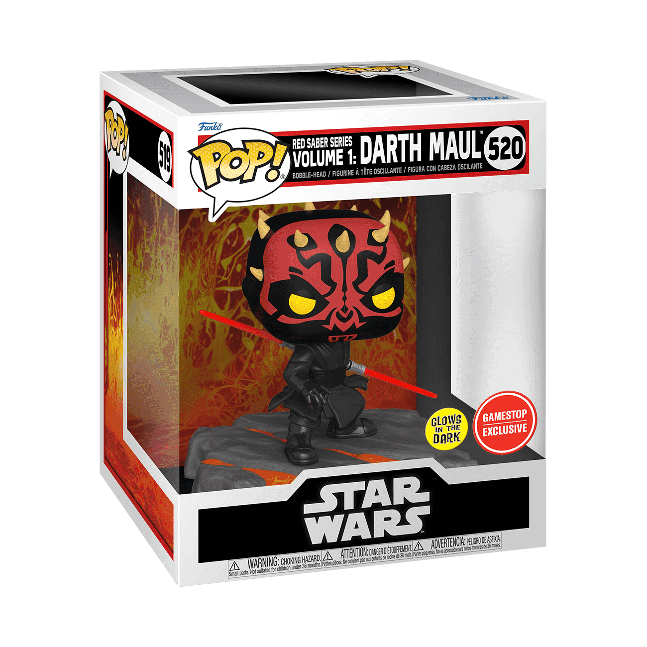 Embrace the power of the Sith with the new, GameStop exclusive Red Saber Series Volume 1: Darth Maul Pop! collectible. The lava and lightsaber™ of this ominous figure glow in the dark! Expand your STAR WARS™ collection empire with the Red Saber Series bobblehead figures today! Vinyl bobblehead is approximately 4.65 in (11.8 cm) tall.