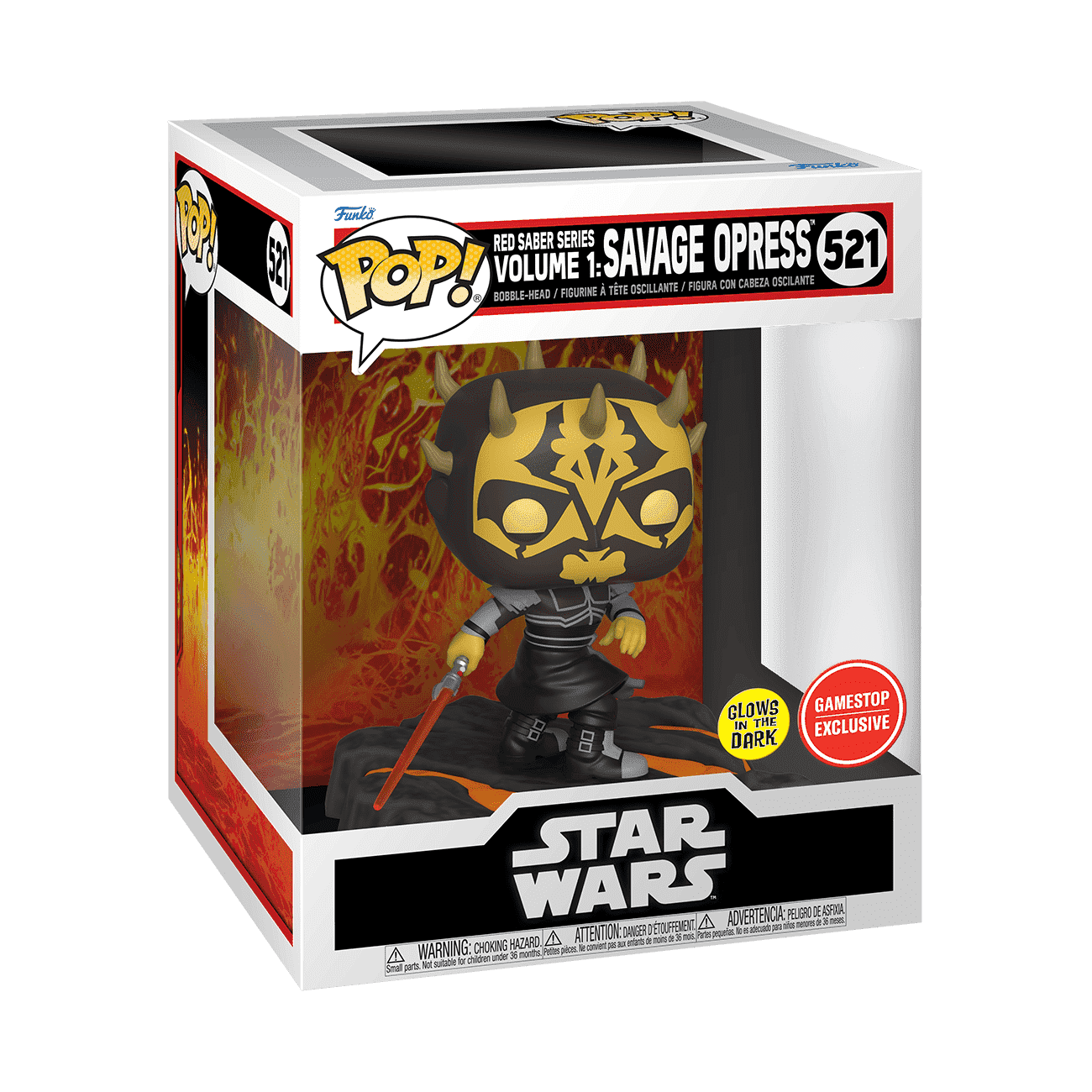 Embrace the power of the Sith with the new, GameStop exclusive Red Saber Series Volume 1: Savage Opress™ Pop! collectible. The lava and lightsabers™ of this ominous figure glow in the dark! Expand your Star Wars™ collection empire with the Red Saber Series bobblehead figures today! Vinyl bobblehead is approximately 4.52 in (11.5 cm) tall.