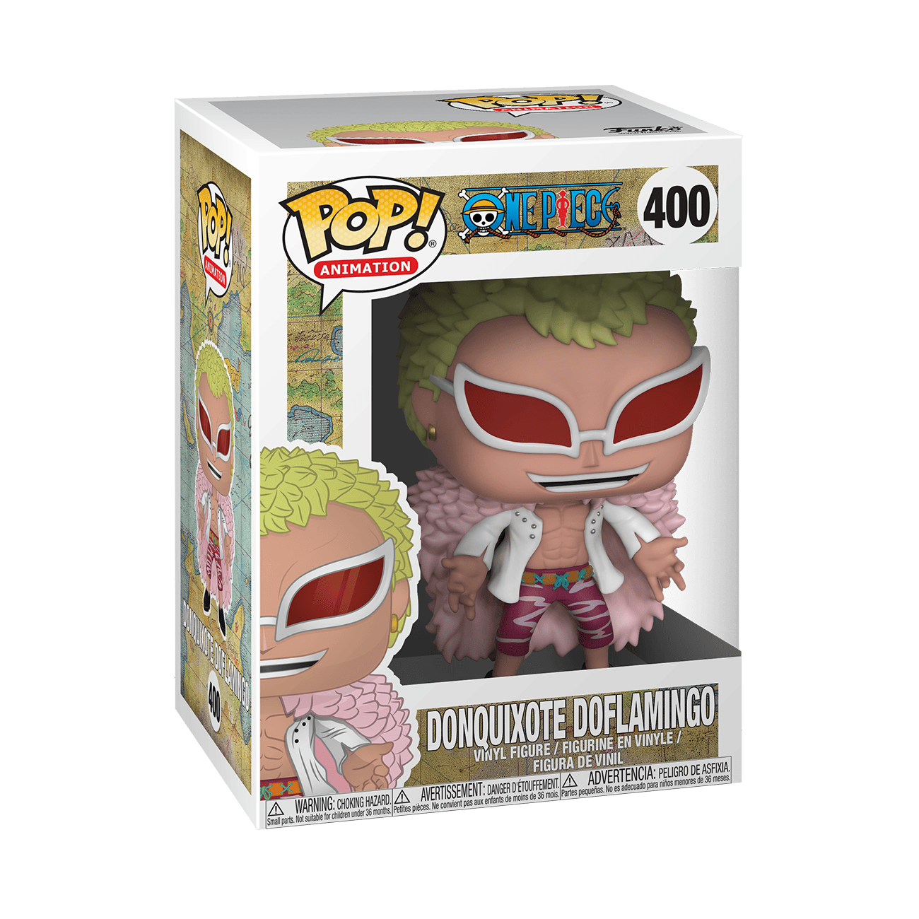 Donquixote Doflamingo is on the hunt to find Luffy and the Straw Hat Pirates to make them pay for his arrest and dethroning. Help Pop! Donquixote Doflamingo find Luffy and his crew by bringing him into your One Piece collection. Collectible stands approximately 3.75 in (9.5 cm) tall.