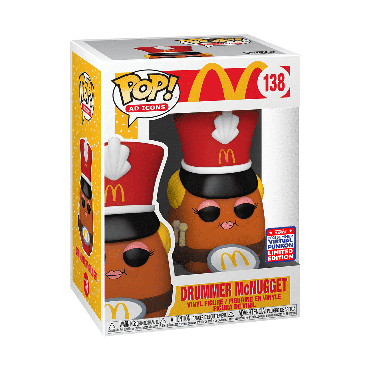Visit the Golden Arches and bring together Ronald McDonald and friends with Pop! Drummer McNugget. Your Ad Icon collection isn't complete without the Drummer McNugget from McDonaldLand. Get yours while supplies last. Vinyl figure is approximately 4 in (10.2 cm) tall. Please note: Product will have the 2021 FunKon sticker on the box. Customer may purchase up to one piece per household. This item does not qualify for discounts or promotions.