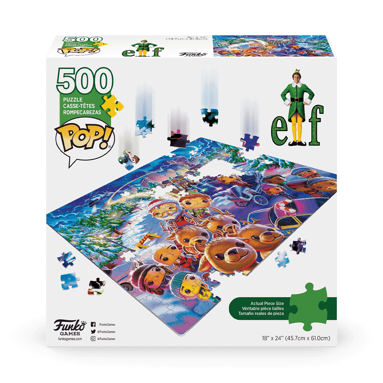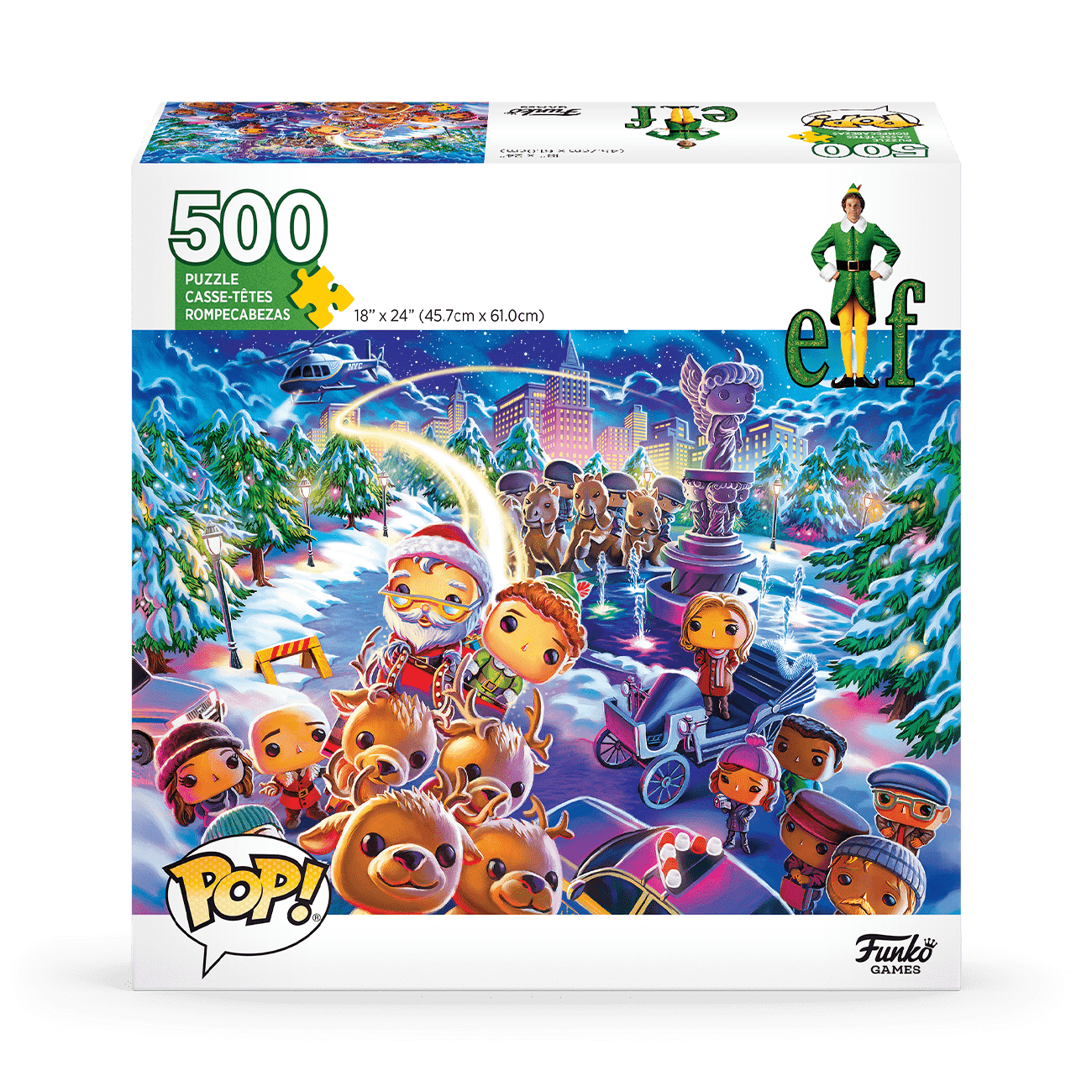 Pop! Puzzle – Elf Watch your favorite pop culture characters take shape as you piece together 500 pieces of fun! This 18” x 24” puzzle uses high-quality materials and vibrant Pop! styled artwork. It’s perfect puzzling for the whole family, featuring an original illustration inspired by the beloved holiday film Elf.