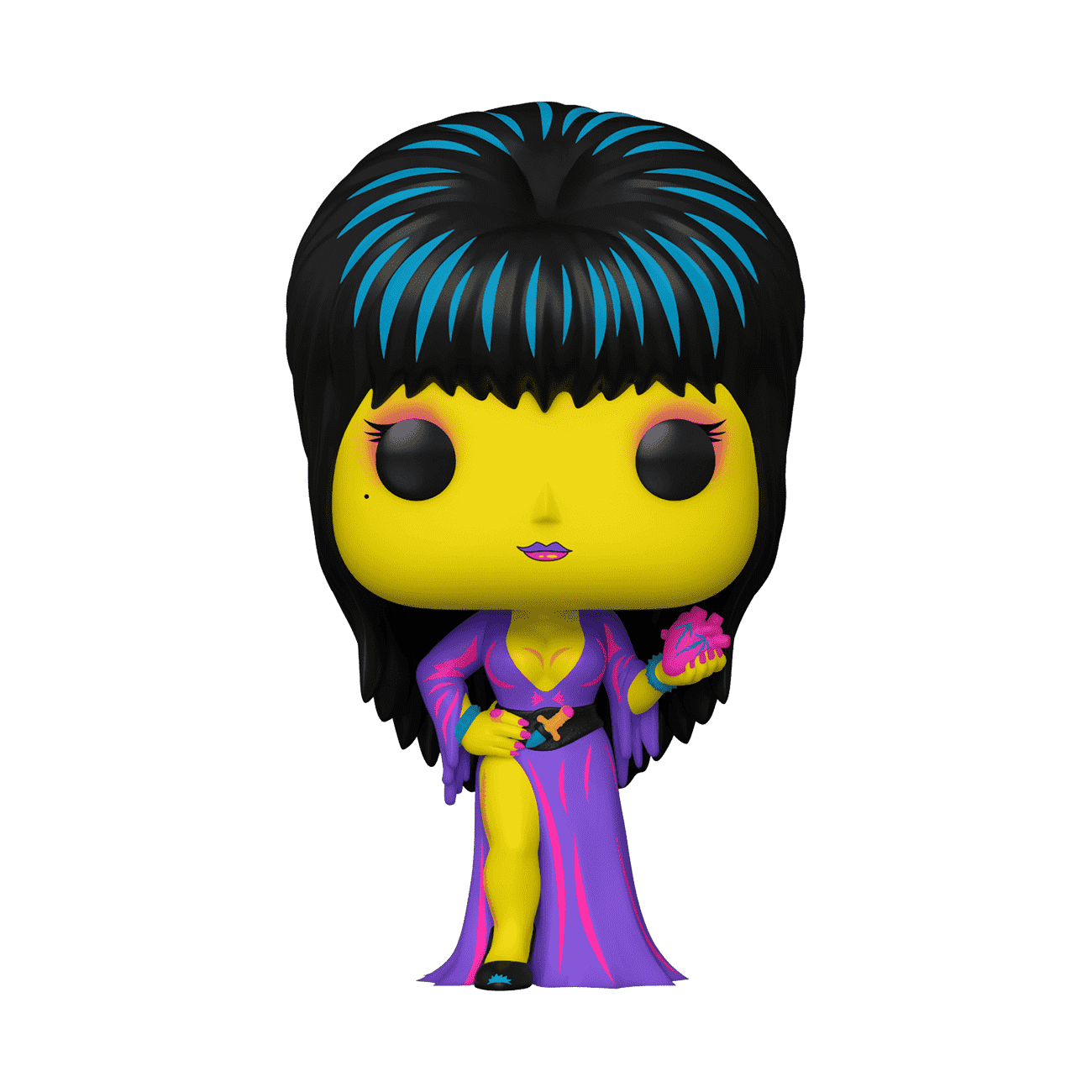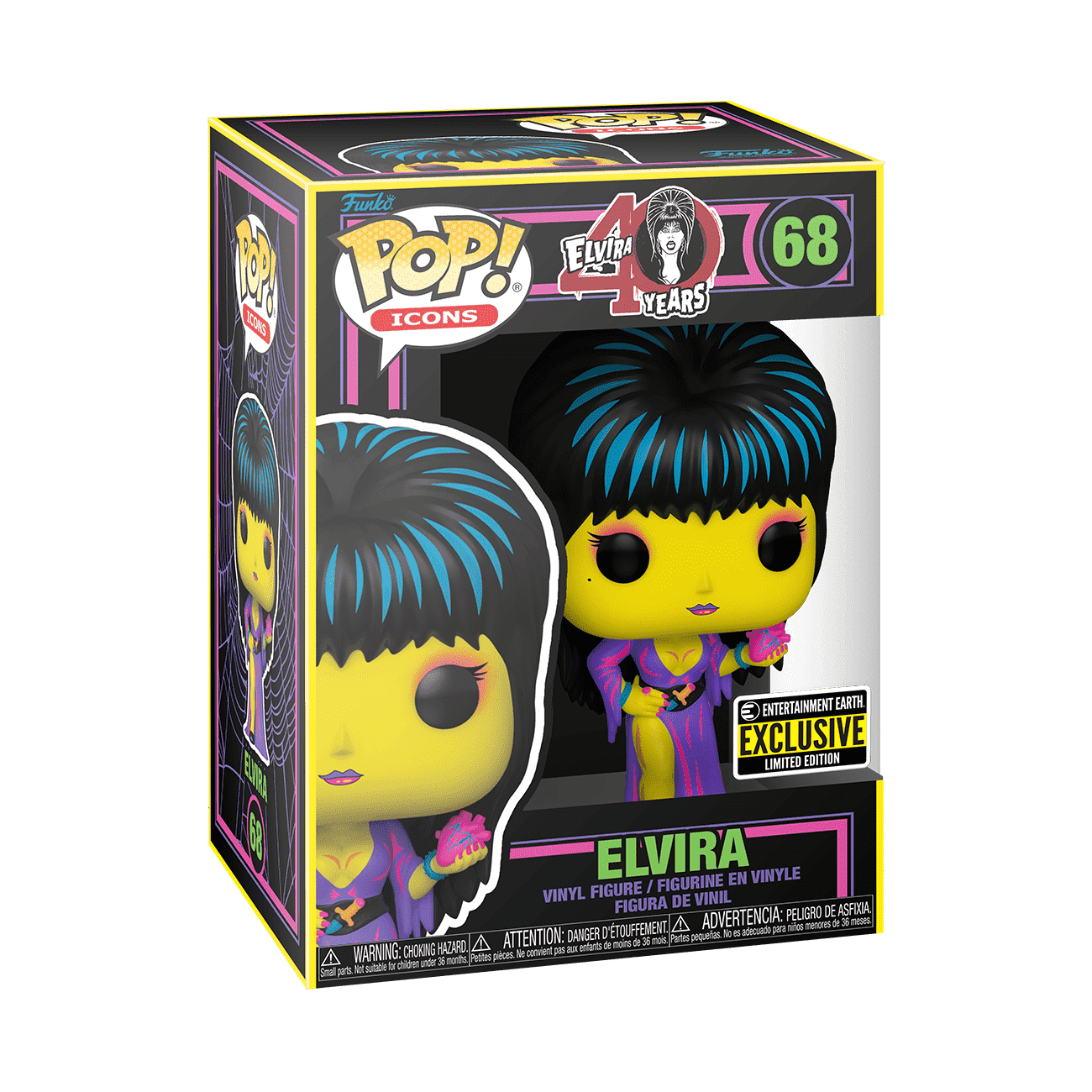 Spend a bewitching evening with Exclusive Pop! Elvira, in the dark! Under a black light, Pop! Elvira glows in haunting colors, and she offers you her heart. Grow your Pop! Icons collection! Vinyl figure is approximately 4 in (10.2 cm) tall.