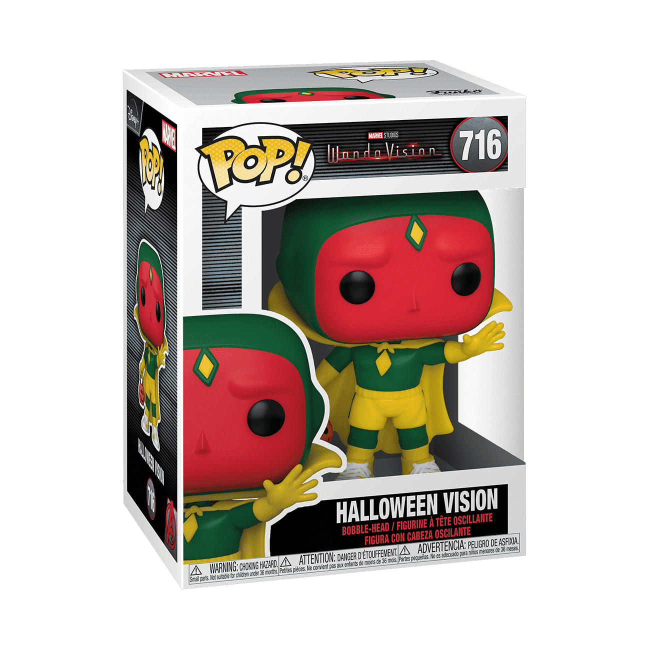 For Halloween this year Vision does not have to disguise his true appearance but rather just dress up in the original comic book version of his costume. Yet things seem to have gone topsy turvy and he needs your help finding Wanda and the rest of their Marvel comrades in your WandaVision collection. Vinyl bobblehead is approximately 3.75 in (9.5 cm) tall.