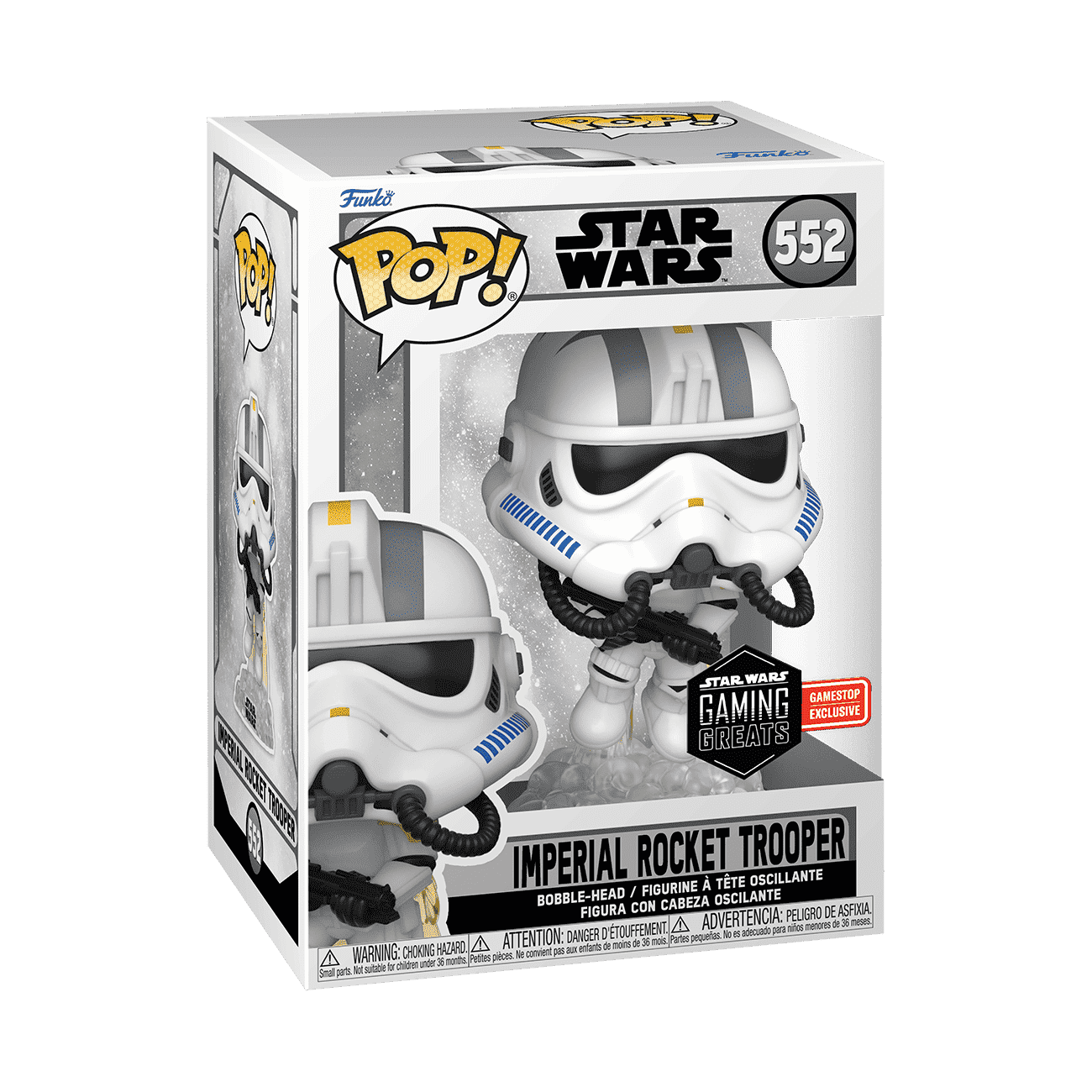 Collect the Star Wars™ Gaming Greats starting with the exclusive GameStop Funko Pop! Imperial Rocket Trooper. This Pop! Imperial Rocket Trooper makes a great reinforcement unit to your Star Wars Battlefront collection. Vinyl bobblehead is approximately 5 in (12.7 cm) tall.