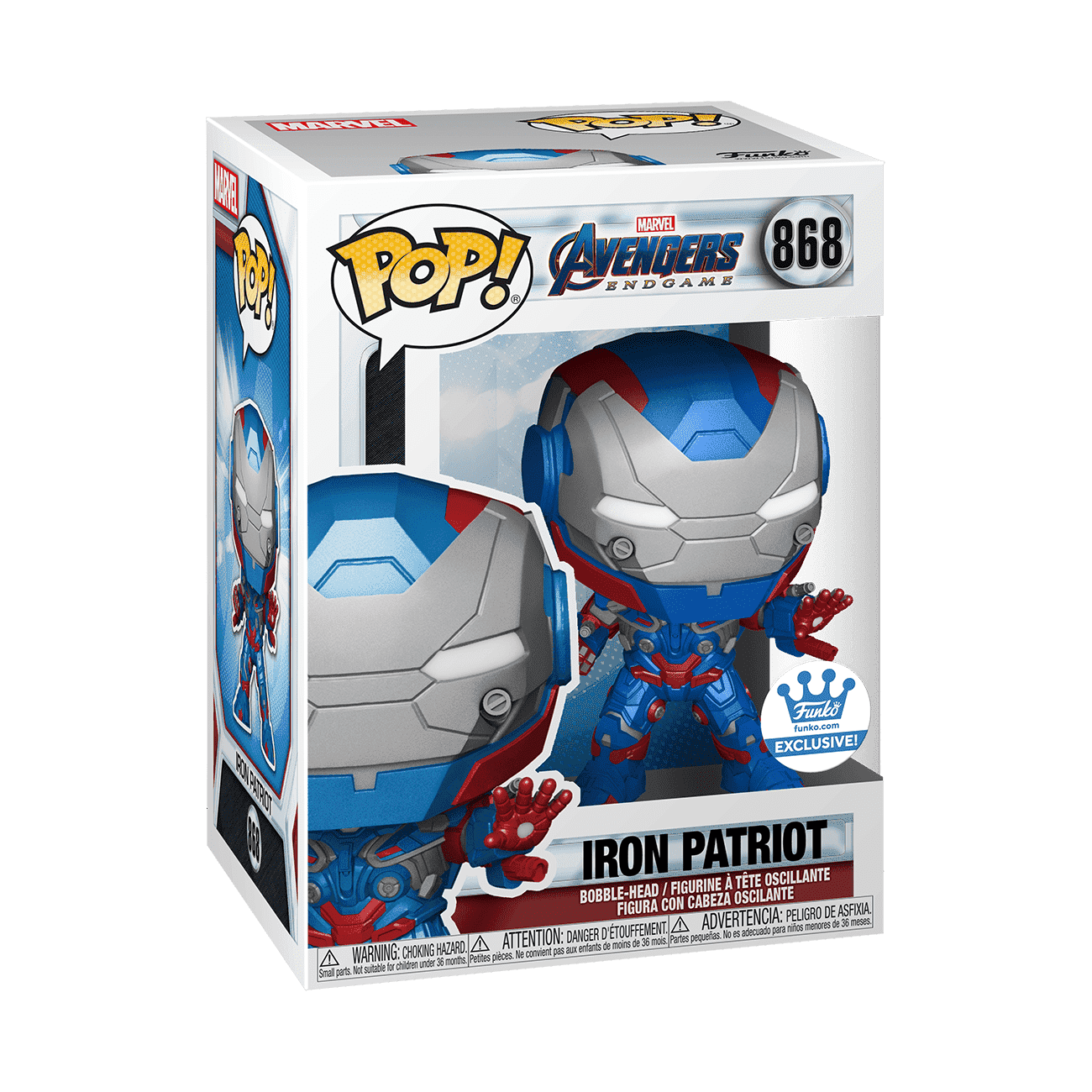 You won't need time travel to relive the gripping Endgame battle. Collect this Funko exclusive, metallic Pop! Iron Patriot to complete your Marvel Endgame collection. Vinyl bobblehead is approximately 3.75 in (9.5 cm) tall. Customer may purchase up to two pieces per household.