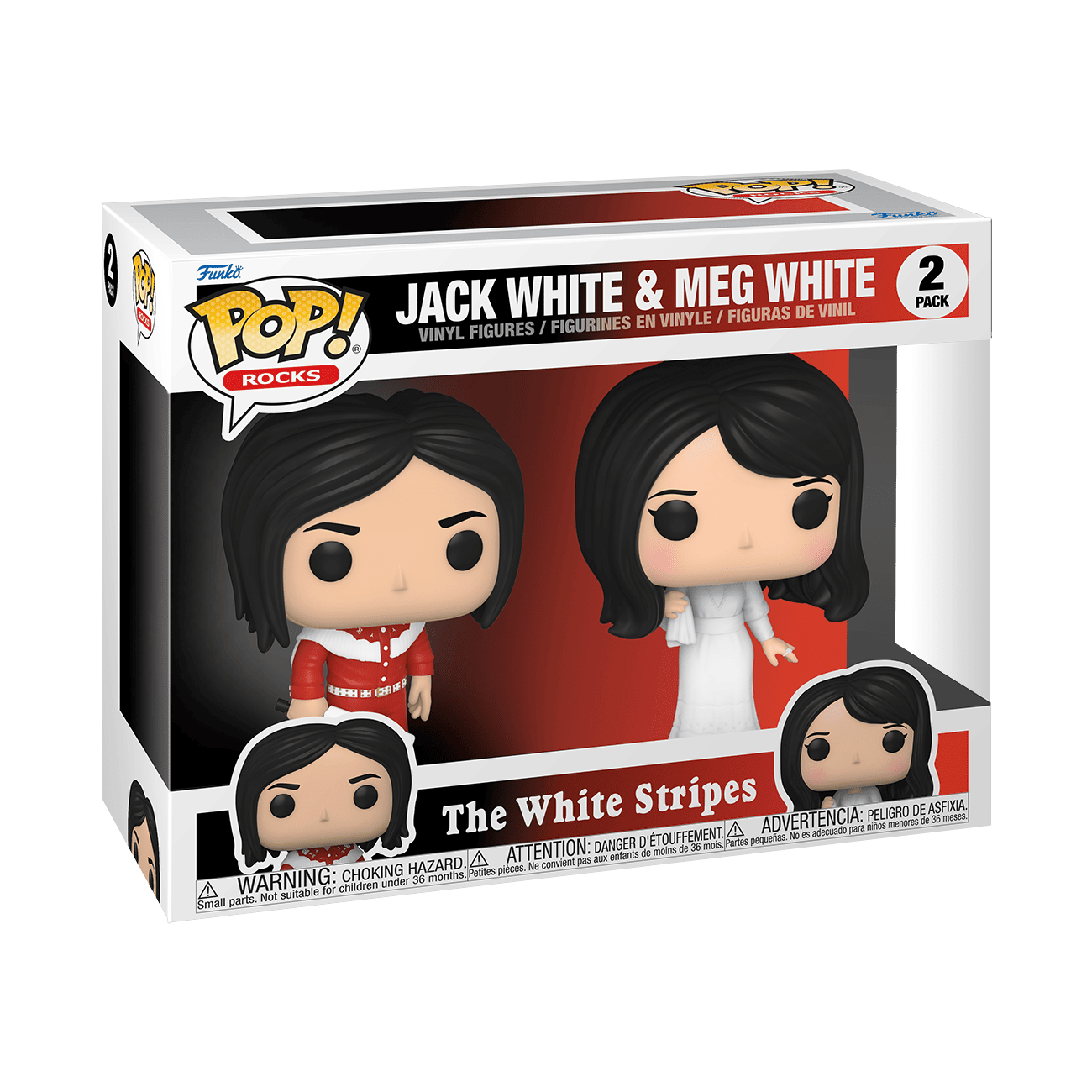 Rock your music collection with The White Stripes Pop! 2-Pack. Recreate the iconic Elephant album with Pop! Jack and Pop! Meg. Pop! Jack holds a white cricket bat from the album front cover, and Meg is dressed in white, holding a tissue. Vinyl figures are approximately 3.90 in (9.9 cm) tall.