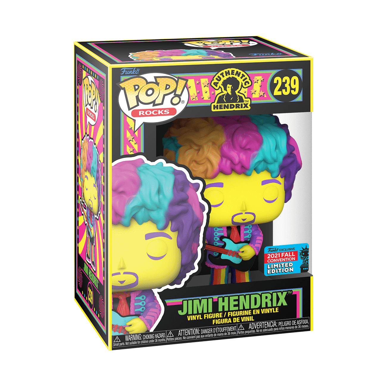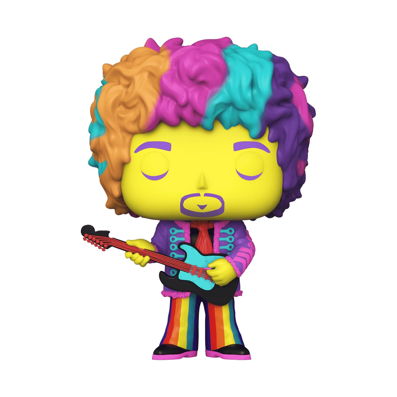Electric guitar virtuoso, Jimi Hendrix has been given the Funko Pop! treatment. Capture the groovy rock star's passionate performances for your music collection with the rainbow blacklight, 2021 Fall Convention exclusive Pop! Jimi Hendrix! Vinyl figure is approximately 4.5 in (11.4 cm) tall.