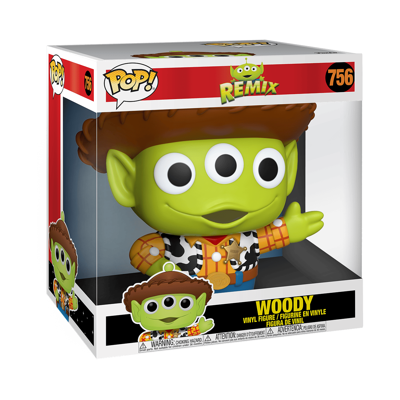 The Pizza Planet aliens are dressed as their favorite characters for Pixar Alien Remix. Introducing super-sized, 10-inch Pop! Alien as Sheriff Woody from Toy Story! Which vinyl figure will win the costume contest in your Disney-Pixar collection?