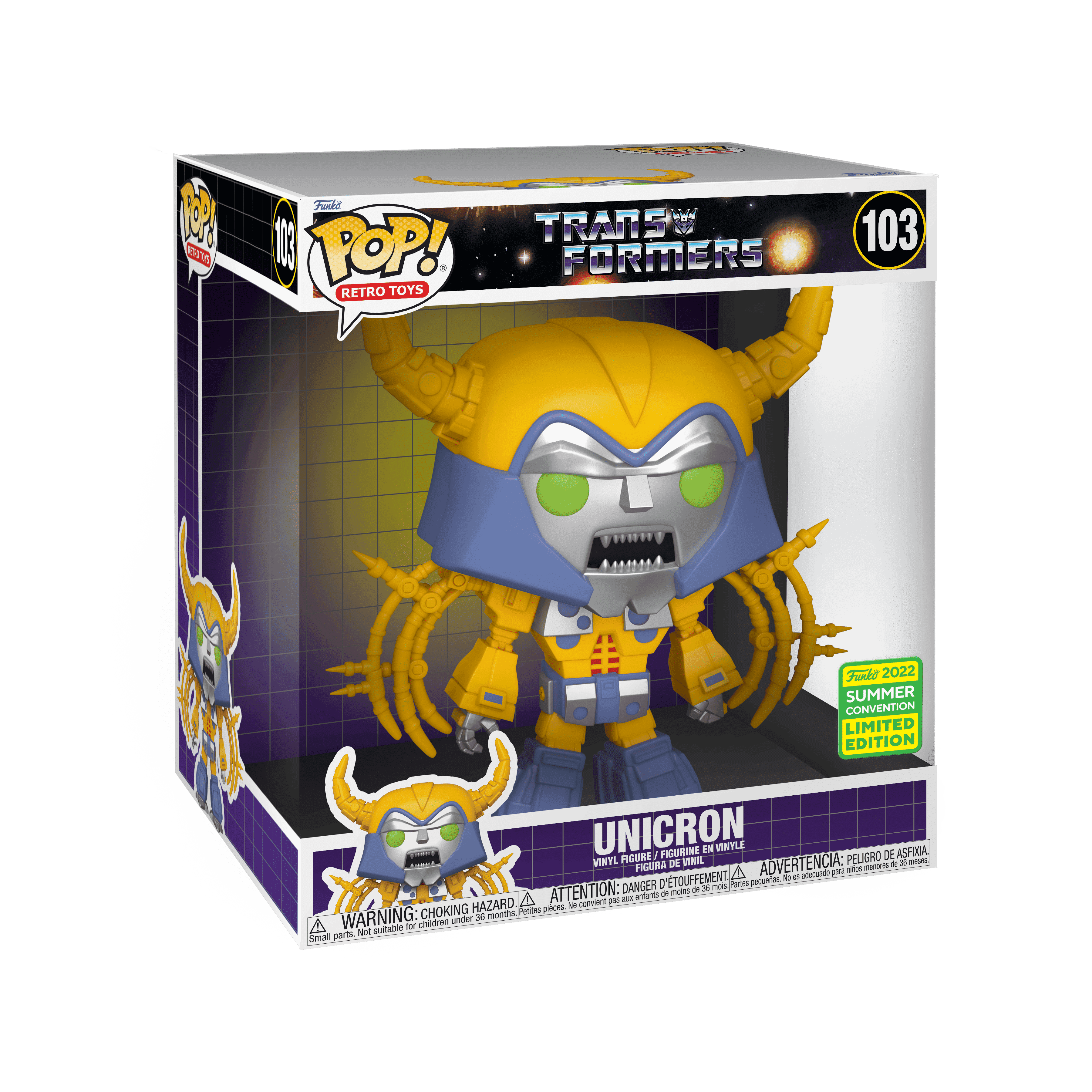 With an appetite for destruction, Jumbo Pop! Unicron is hungry for more and wants to join your Pop! Retro Toys collection. To keep him from unleashing any more chaos, add the 2022 San Diego Comic-Con exclusive Jumbo Pop! Unicron to your Transformers set. Vinyl figure is approximately 10.5 in (26.7 cm) tall.